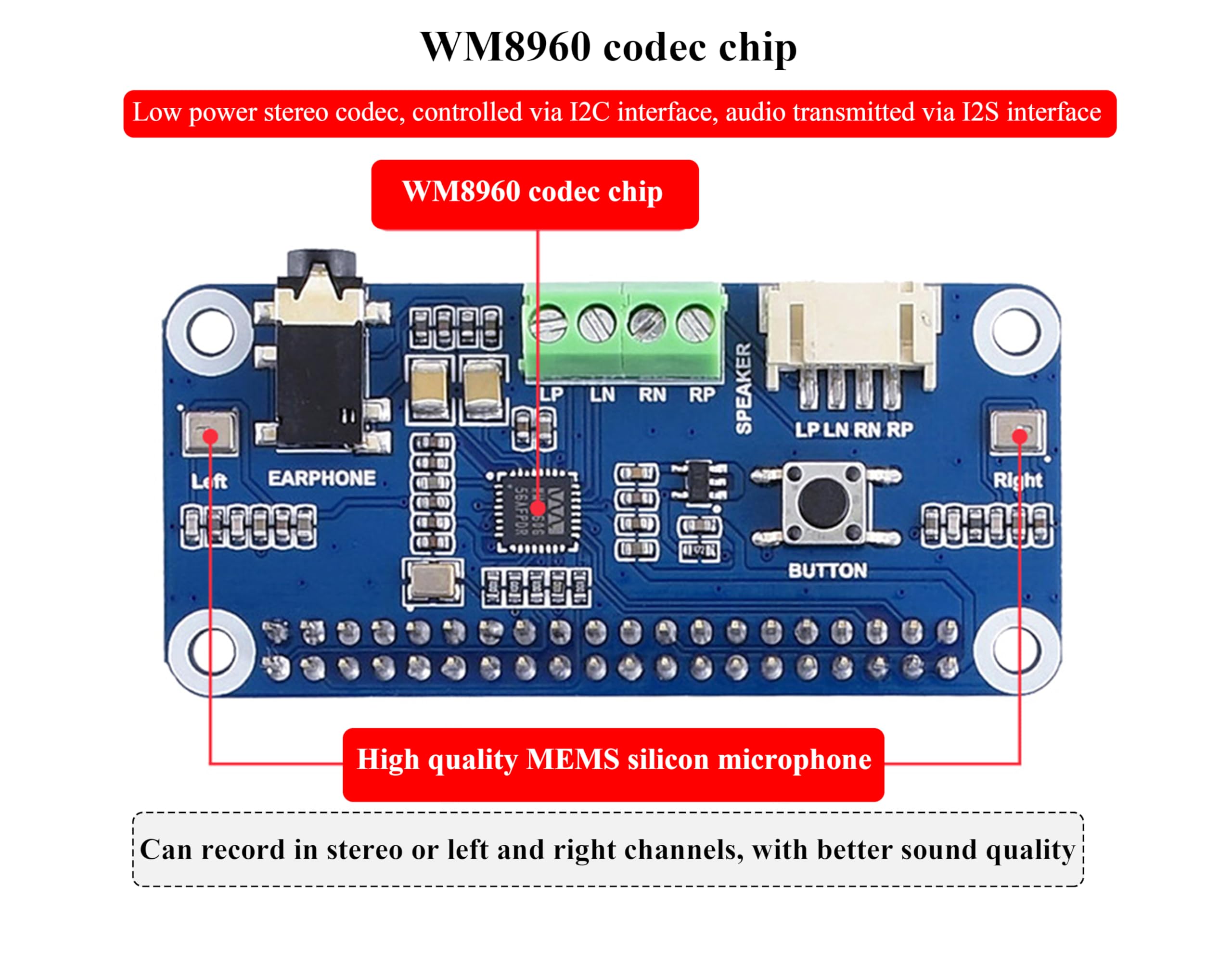 Integrates dual high-quality MEMS silicon Mic, supports left & right double channels recording, nice sound quality., Onboard standard 3., 5mm earphone jack, play music via external earphone This is a sound card HAT compatible with Raspberry Pi, has low power consumption, supports stereo encoding/decoding, features Hi-Fi playing/recording. This is a sound card HAT designed for Raspberry Pi, low power consumption, supports stereo encoding / decoding, features Hi-Fi playing / recording, what's more, it can directly drive speakers to play music I Tested the Raspberry Pi Sound Card Onboard dual-channel speaker interface, directly drives speakers Audio HAT Module for Raspberry Pi 4B/3B /3B/2B/B /A /Zero/Zero W Supports sound effects such as stereo, 3D surrounding, etc. Comes with development resources and manual (python demo code for playing / recording): n9., cl/ugb2e HAT Pinout WM8960 Chapeau Audio Compatible Avec RPi 5/4B/3B /3B/2B/Pi Zero/Zero W/Zero WH/Pi Zero 2W/Zero 2W/Zero 2WH, WM8960 Carte Son Hi-Fi, Code Stéréo, Lecture/enregistrement Hi-Fi, Livré Avec Haut-parleur Best Microphone For Integrates WM8960 low power stereo CODEC, communicates via I2S interface. Features 1)With standard 40PIN GPIO extension header, compatible with Raspberry Pi series boards. 5)Onboard dual-channel speaker interface, directly drives speakers.