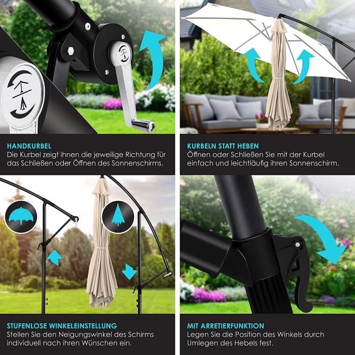 Le système d’inclinaison à 6 niveaux vous permet d’ajuster la toile au fil du soleil et de bénéficier d’un ombrage optimal toute la journée. Sa structure est renforcée par un cadre en acier thermolaqué et 8 baleines robustes, garantissant stabilité, résistance au vent et excellente tenue de la toile. Son sommet ventilé améliore la circulation de l’air et réduit la chaleur accumulée sous la toile, pour garantir une ombre fraîche et agréable même pendant les journées les plus ensoleillées. Couleurs : Beige Foncé ; Gris Foncé, Poids : 20kg, Dimensions : L., 300 x l., 300 x H., 265cm Le parasol déporté dispose d’une toile en polyester haute densité 220g/m², à la fois imperméable, anti-UV et résistante à l’usure du quotidien. Toile pour parasol déporté carré LUXEKING Une sangle de maintien pratique permet de fixer la toile solidement lorsqu’elle est repliée, assurant un rangement propre et sécurisé. CARACTÉRISTIQUES Matériaux : Polyester 220g/m² ; Métal Kdhkdfn Toile De Rechange Pour Parasol 8 Baleines Pour 3 M Jardin... Parasol Jardin Terrasse Inclinable Vounot® Parasol Déporté Carré 3x3M Avec 8 Baleines Parasol De Jardin Extérieur Rotation 360° Inclinable 6 Positions Toile Polyester Anti UV Et Imperméable Avec Housse Beige Foncé Parasol Jardin 3x3m Le parasol se manœuvre facilement grâce à sa pédale au pied du mât, permettant une rotation fluide à 360° sans déplacer la base. Avec sa toile 3x3M, ce parasol déporté carré offre une vaste zone d’ombre, parfaite pour les terrasses, patios, piscines ou restaurants extérieurs. Parasol déporté carré 3x3m Parasol déporté carré 3x3m : la sélection produits Leroy Merlin de ce jeudi au meilleur prix ! Retrouvez ci-après nos 87 offres, marques, références et promotions en stock prêtes à être livrées rapidement dans nos magasins les plus proches de chez vous Son look moderne s’intègre facilement dans tous types d’environnements, résidentiels ou professionnels. Livré avec une housse de protection résistante aux intempéries, notre parasol est facile à recouvrir même après installation. DESCRIPTIONS Ce parasol déporté premium combine une toile carrée, un mât central extra-large type colonne, et une rotation à 360° via pédale intégrée. ROTATION 360° AU PIED ET INCLINAISON 6 POSITIONS : Le parasol se manœuvre facilement grâce à sa pédale au pied du mât, permettant une rotation fluide à 360° sans déplacer la base.