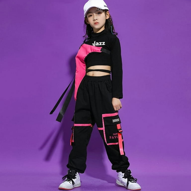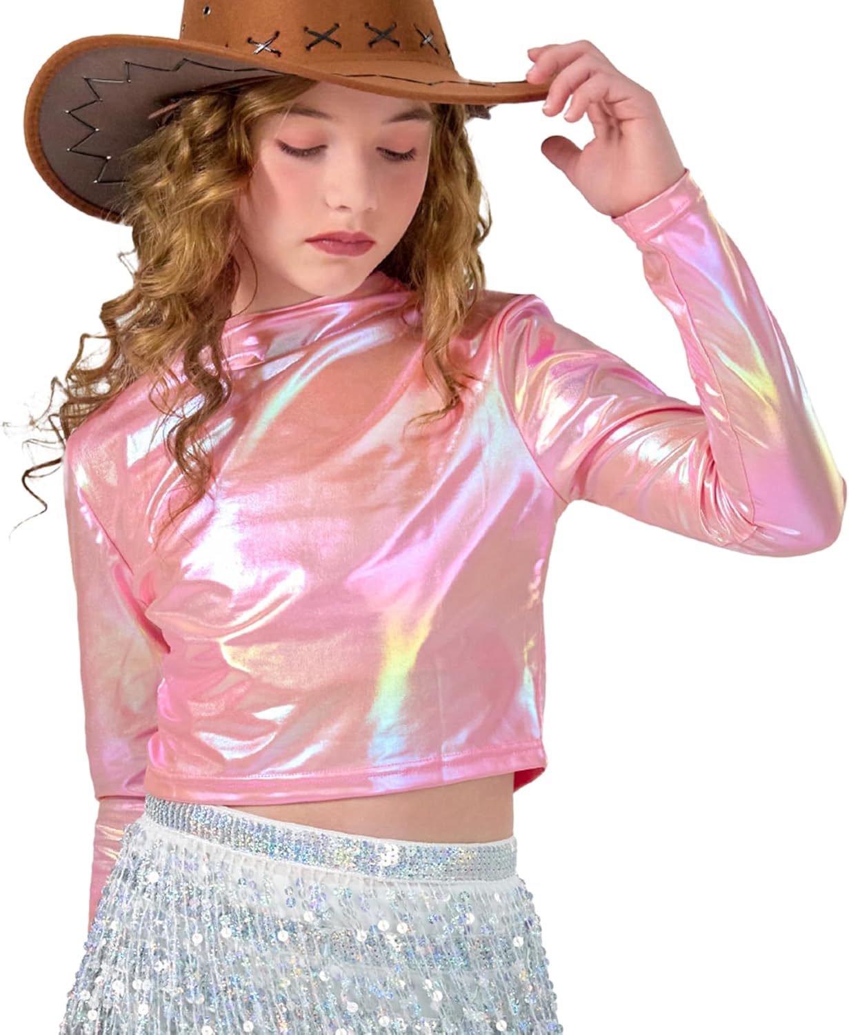 LOLANTA Enfant Fille Haut Danse Métallique Crop Top Danse Tenue Moderne Hip-hop Latine Jazz Spectacle Carnaval Fête Brillant Disco T-shirt Manches Courtes Avec Manchon Bras, Rose, 11-12 Ans, 160