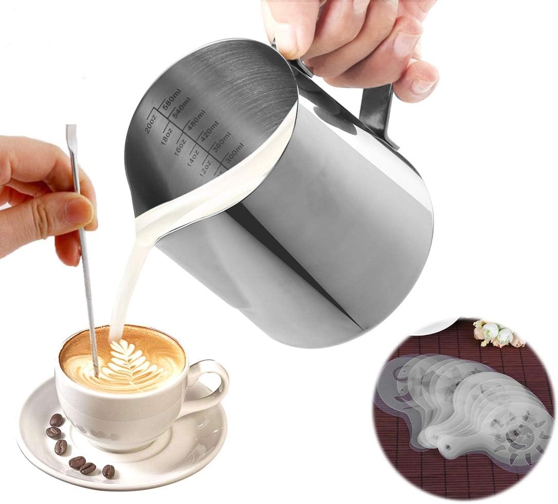 Qualité supérieure en acier inoxydable 304 : le pichet à lait et le stylo type café sont fabriqués en acier inoxydable 304 avec une finition chromée. Matériau : acier inoxydable 304 Taille de l'article : pot à mousser le lait : 300 ml (environ 350 ml). Pichet à mousse de lait en acier inoxydable, 350 ml, pour lait, café, cappuccino, latte, art barista, dimensions des deux côtés à l'intérieur, stylo et chiffon Fabriqué en acier inoxydable 304 de qualité alimentaire, il a été poli, traitement antirouille et anti-corrosion, durable et sûr à utiliser. Le corps est... Le pichet à lait en acier inoxydable est résistant à la rouille, aux taches, à la chaleur et non toxique, également incassable en cas d'utilisation quotidienne – un choix durable pour les amateurs de café., Pichet Lait Pot à Lait Inox 350ml Pour Cappuccino - Avec Stylo Art Le design personnalisé permet un transport facile et permet d'économiser de l'énergie, pratique pour une utilisation quotidienne., Contenu de l'emballage complet : un pot à lait en acier inoxydable (pot à mousseur à lait), un pot à expresso en acier inoxydable de 350 ml, un distributeur de poudre en acier inoxydable, un stylo latte art et 16 pochoirs à cappuccino – tout ce dont vous avez besoin pour une préparation professionnelle du café. Pot à Lait Barista 350 Ml Avec Stylo Latte Art Pichet Anti-adhésif Pour Art Latte De 350 Ml Avec Lignes De Mesure, Pichet à Mousser Le Lait Pot à Mousseur Lait Contenu : 1 pot à lait en acier inoxydable (pot à mousseur à lait), 1 épandeur de poudre en acier inoxydable, 1 stylo latte art, 16 pochoirs à café et cappuccino Caractéristiques techniques : - Capacité du pot à mousseur à lait : 300 ml (environ 350 ml) - Matériau : acier inoxydable 304 (pour les pots à lait en acier inoxydable, les stylos à café, etc. ) - Nombre de pochoirs à café : 16 pièces., Caractéristiques : 1., Haute qualité : fabriqué en acier inoxydable 304, résistant à la rouille et à la chaleur, durable pour une utilisation quotidienne., 2., Combinaison pratique : pot à mousseur à lait + stylo latte art + pochoirs, idéal pour créer des motifs de café et faire mousser le lait., 3., Facile à utiliser : design à bouche pointue pour éviter les fuites, soudure solide sur la poignée, facile à transporter et à utiliser., Couleur : argenté.