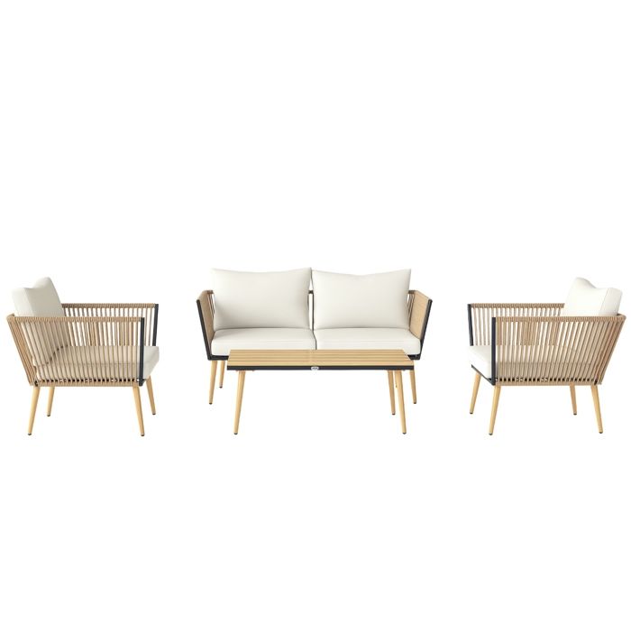 Salon De Jardin Exterieur 6/8 Personnes Outsunny Ensemble Salon De Jardin 4 Pièces Canapé 2 Places + 2 Fauteuils + 1 Table Basse Plateau Verre Trempé 8 Coussins - Métal Et Résine Tressée - Beige Salon De Jardin 2 Personnes Ce splendide ensemble salon de jardin se composant d'un canapé 2 places, de 2 fauteuils et d'une table basse sublimera votre extérieur L'ensemble de salon de jardin Outsunny qui se compose de 2 fauteuils, 1 canapé 2 places et d'une table basse ronde avec plateau effet bois, vous permet de créer un espace de convivialité et de partage où vous aurez plaisir à vous retrouver avec vos familles ou amis. Salon de jardin 4 pièces comprend 2 fauteuils, 1 canapé et 1 table basse... Résistant à la rayure Outsunny Salon de jardin 4 pièces 4 personnes avec canapé 2