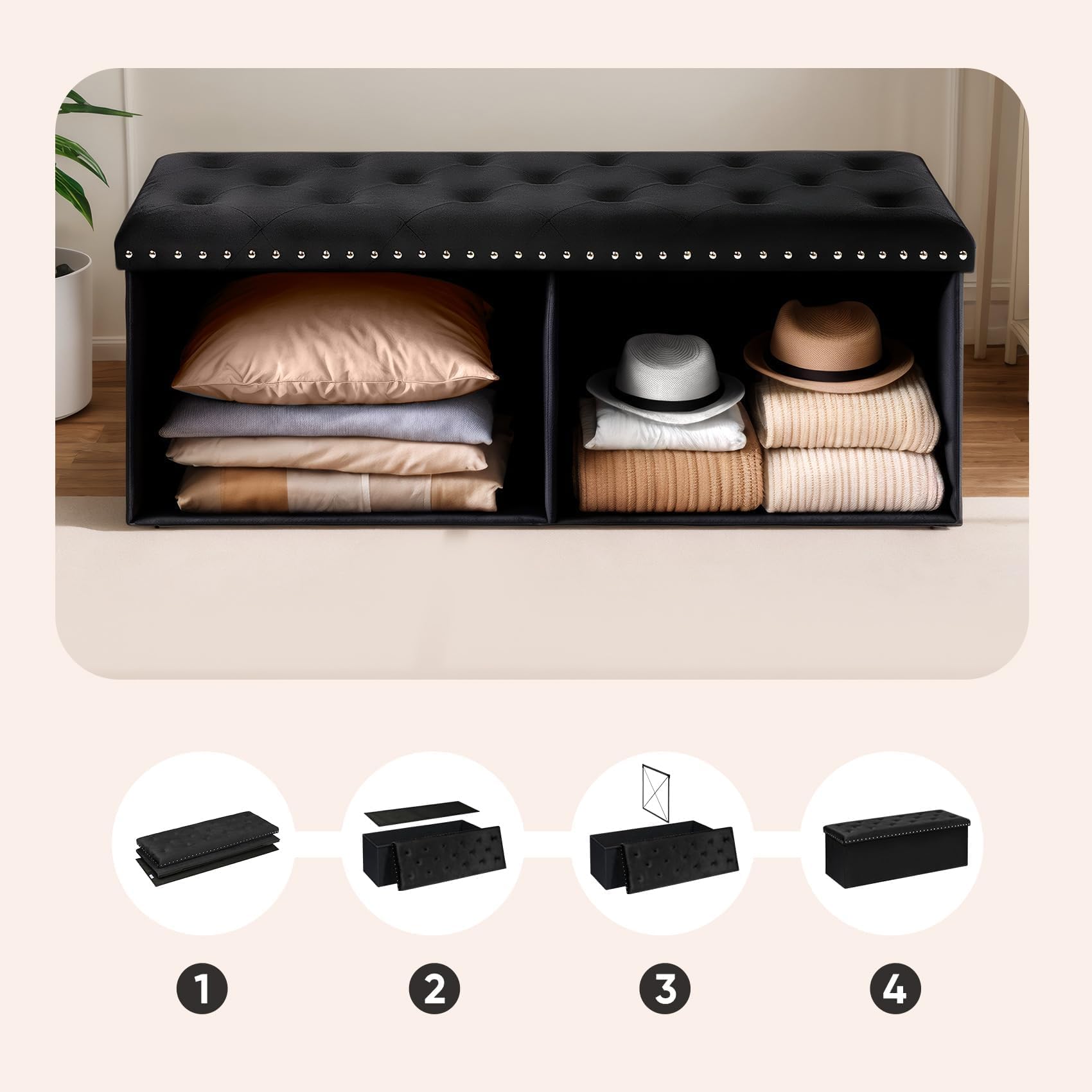 【Foldable】 : facile et rapide à assembler, un nouveau meuble en quelques secondes, et facile à plier et à ranger pour économiser de l'espace lorsqu'il n'est pas utilisé, taille dépliée : 40 x 40 x 40 cm, taille pliée : 40x 20 x 40 cm. 【Matériaux de haute qualité】 : MDF de qualité E1 en bois certifié FSC, avec une capacité de charge statique de 120 kg, une structure stable et durable, et pas facile à déformer sous une pression à long terme. 【Storage space】 : Espace de rangement caché pour les livres, les magazines, les couvertures, les jouets et d'autres articles pour garder la pièce propre et bien rangée, et facilement accessible à tout moment. Meuble Multifonction Design Rivets Pouf, Coffre De Rangement, Tabouret Avec Repose-Pieds, Pliable, Banc Avec Rangement, 32 X 40 X 33,5 Cm, Gris Foncé | Leroy Merlin Pouf Salon Velours Banc de Rangement, Tabouret rembourré Pliable, 76 x 38 x 40 cm, Coffre avec Couvercle, Pieds en Bois Massif, Volume 65L, Capacité de Charge 300 kg, pour Chambre, Couloir, Gris foncé CASARIA® Tabouret cube avec espace de rangement blanc petit pouf... Ottoman Pouf Repose Pied Rangement, Coffre Banquette Poufs Carré