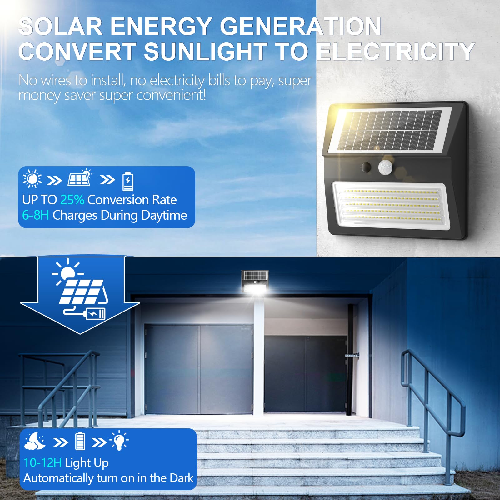 Luminaire solaire sont fabriquées en matériau ABS durable et de haute qualité, IP54 imperméable, anti-poussière, résistant à la chaleur, antigel Lampe Solaire Exterieur Super Lumineuse]lampe solaire d'extérieur améliorée est équipée de 130 perles LED ultra lumineuses de haute qualité avec une luminosité allant jusqu'à 450LM, ce qui est plus lumineux que les autres lampe solaire avec détecteurs de mouvement sur le marché, luminosité augmente de 50 【Lampe Solaire Exterieur Super Lumineuse】Giliwosy lampe solaire d'extérieur améliorée est équipée de 130 perles LED ultra lumineuses de haute qualité avec une luminosité allant jusqu'à 450LM, ce qui est plus lumineux que les autres lampe solaire avec détecteurs de mouvement sur le marché, luminosité augmente de 50%. 【Facile à Installer】Veuillez garder le panneau solaire face au soleil pour une meilleure charge. Veuillez couvrir le panneau solaire avant l'installation, vérifier s'il fonctionne correctement et ajuster le mode de fonctionnement Équipé d'autocollants supplémentaires pour trous de vis, vous pouvez le coller sur le mur avant de percer les trous de vis, ne vous inquiétez plus des positions incorrectes des trous de vis. 【Haute Efficacité & Économie d'énergie】Projecteur solaire extérieur avec détecteur de mouvement utilise des panneaux solaires en silicium polycristallin améliorés pour convertir l'énergie solaire en énergie électrique, avec une photosensibilité plus élevée, un taux de conversion de l'énergie solaire jusqu'à 25% et une durée de vie de plus de 3 ans. Destockage Noël : Lampe Solaire Exterieur Détecteur de Mouvement Charge rapide, longue durée d'utilisation et haute luminosité. Lumiere solaire peuvent parfaitement éclairer extérieurs. Mode 3 (mode capteur intelligent): faible luminosité de 30% en l'absence de mouvement, pleine luminosité de 100% lorsqu'un mouvement est détecté Pour la plupart des éclairages extérieurs, l'IP 44 suffit. Les lampes dotées de ce type de protection sont protégées contre les projections d'eau et donc aussi... Projecteur Solaire 130 LED ZGXQDK Lampe Solaire Exterieur 6000mAh Lumière Solaire Extérieure Lampe Solaire Détecteur Mouvement 【3 Modes d'éclairage Intelligents】Mode 1(mode d'éclairage du capteur): Lumière s'éteint lorsqu'il n'y a pas de mouvement et s'allume complètement pendant 20s lorsqu'un mouvement est détecté.