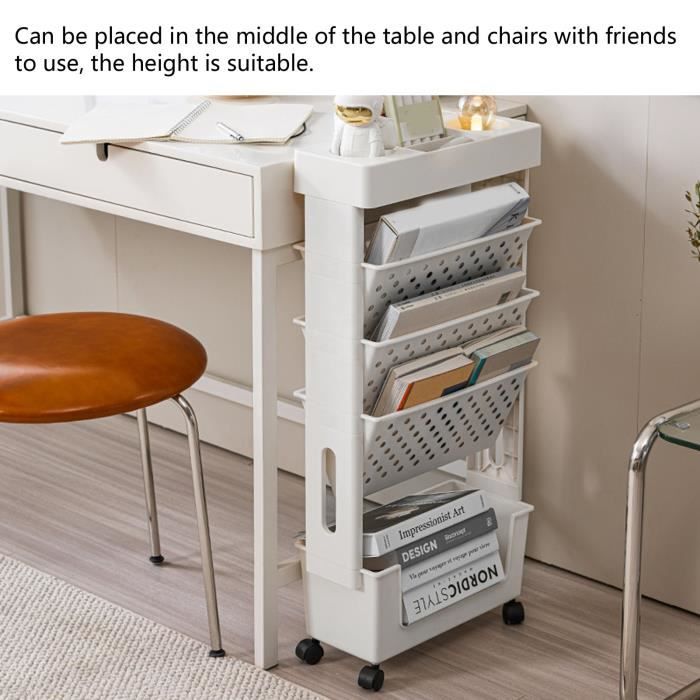 Facile à déplacer : grâce aux 4 roues et à la rotation à 360°, le design mobile de la bibliothèque permet un mouvement facile sur le lieu de travail pour une utilisation facile. Étagère de rangement : l'organisateur de rangement à roulettes est une bibliothèque et un support d'étagère en un seul et offre un moyen parfait d'organiser des livres, des magazines ou d'autres désordre. Le design simple et épuré fait de la bibliothèque un ajout accrocheur et élégant à n'importe quelle pièce de votre maison et de votre bureau. La grande bibliothèque avec étagères ouvertes offre assez d'espace de rangement ou d'exposition pour vos livres, photos et autres décors Grande capacité de charge : avec un cadre en ABS de haute qualité, ce chariot de rangement à roulettes assure une utilisation durable sans déformation ni secousse Cependant, si vous avez besoin de la fixer, vous pouvez appuyer sur le bouton de fixation de la roue pour la verrouiller en place. GDWD Bibliothèque mobile, avec 6 niveaux et roulettes, étagère de Peu encombrante : la bibliothèque amovible prend moins de 0,1 ㎡ d'espace et peut être placée dans n'importe quel coin étroit. Cela permet d'économiser beaucoup d'espace et est idéal pour ranger des vidéos, des albums, de l'artisanat ou d'autres objets de collection populaires. Organisateur De Bureau Mobile GCCSSBXF Chariot à Livres Compact à Roulettes – Étagère Mobile Avec Roulettes, Chariot De Rangement De Bureau Multifonction Pour Espaces étroits – Étagère D'angle En Métal Et Porte-revues Bibliotheque Enfant Grâce à son design incliné unique, vous pouvez facilement retirer les livres, ce qui ajoute une touche élégante à votre maison ou votre bureau. Spécifications: Type d'article : bibliothèque mobile Matériau : PP, PS Couleur : blanc/bleu/rose. Remarque : Les mesures étant prises à la main, les tailles indiquées peuvent varier légèrement.