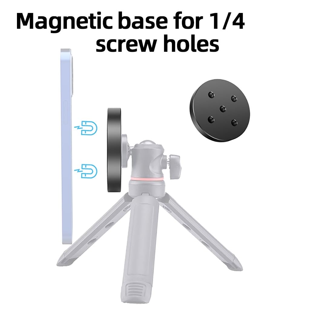NEEWER Adaptateur Support Trépied Magnétique Téléphone avec Bague Accessoire Trépied Téléphone Fixation Rapide FEICHAO Support Magnétique Pour Téléphone Portable Avec Trou Trepied Magsafe Poids du mini trépied : 10 kg. FEICHAO Support de téléphone magnétique Mini trépied 1/4 compatible avec les accessoires de support de téléphone MagSafe Base magnétique : Trous de filetage : 6,35 mm. Rotation à 360 degrés - Mini tête sphérique pivotante de 6,35 mm en option : Matériau : alliage d'aluminium. Le bas du clip de téléphone portable est équipé d'un trou de vis de 1/4 de profondeur de 3,5 mm, permettant d'étendre la perche à selfie du trépied pour une meilleure stabilité Longueur : 54 mm, largeur : 28 mm Le bas du trépied est conçu avec des coussinets antidérapants en caoutchouc haute performance, qui ne sont pas faciles à déplacer lorsqu'ils sont placés. Trépied Mini tête sphérique pivotante de 6,35 mm pouvant pivoter à 360 degrés., Pratique à utiliser. Mini trépied en option : Application : appareil photo reflex, téléphone portable.