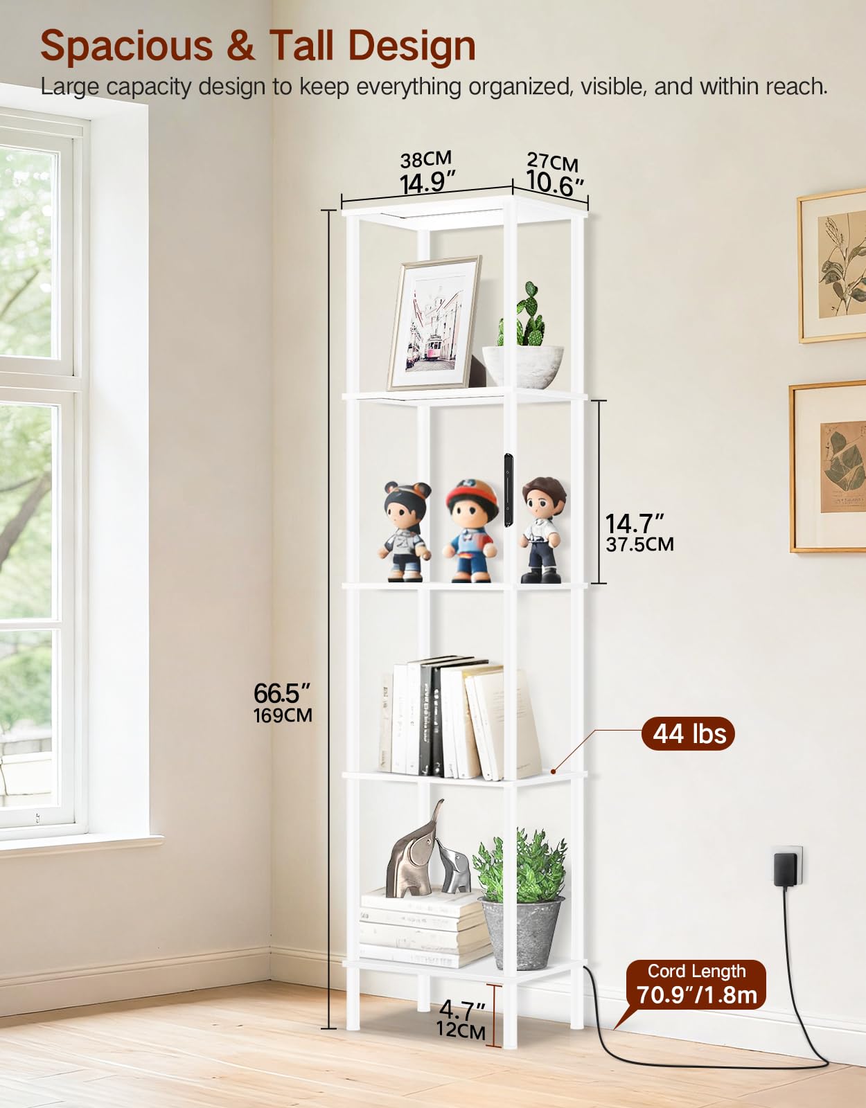 Deux systèmes anti-basculement assurent une sécurité optimale : bande adhésive sans perçage pour murs lisses et chevilles pour murs texturés. Lampadaire Sur Pied Salon,Lampadaire Led 18W 1500Lm Avec Télécommande OUTONLIFE Lampadaire sur Pied avec Étagères d’Angle, LED Intégrée Tactile & Télécommande, 3 Températures de Couleur, Intensité Réglable, Lampe avec 5 Niveaux pour Salon, Chambre, Bureau Marque La minuterie automatique d’une heure et la fonction mémoire garantissent que la lampe s’allume toujours sur vos réglages préférés. Son design moderne et épuré s’intègre harmonieusement à tout intérieur, et sa surface lisse facilite l’entretien. Le câblage discret assure un espace propre et ordonné. Idéal pour lire, se détendre ou recevoir, ajustez facilement la luminosité selon votre humeur. N’hésitez pas à nous contacter pour toute question, nous sommes là pour vous accompagner. 1 3 Temp. Lampe Sur Pied De Salon 1,6m LED Lampadaire Eois, Lampe De Plancher Avec 3 Étagère, 3 Températures De Couleur Lampe Sur Étagère Lumineuse LED Télécommande Commande Tactile & Télécommande:Réglez instantanément la lumière grâce au bouton tactile ou à la télécommande fournie, qui se fixe directement sur l’étagère. Lustre 140W avec Télécommande, Luminaire Suspendu LED à 4 Lumières... Design Gain de Place & Polyvalent:Alliant fonctionnalité et style, ce lampadaire à 5 niveaux s’adapte parfaitement aux coins et petits espaces. Notre service client reste à votre disposition et nous proposons jusqu’à 2 ans de garantie. Éclairage LED Personnalisable:Notre lampadaire avec étagères intègre un éclairage LED à intensité variable et 3 températures de couleur. Parfait pour une ambiance coordonnée dans de grands espaces. Scannez le QR code pour accéder à une vidéo tutorielle. Dimensions : 32 cm L x 27 cm l x 169 cm H. Utilisez-le pour exposer livres, plantes ou objets déco tout en éclairant la pièce. 1 Salon 2 Chambre 3 Salle de Jeux 4 Balcon 5 Bureau à Domicile
