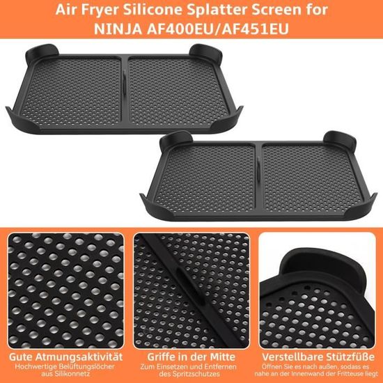 Caractéristiques : Matériau : silicone. Protège ta friteuse Ninja AF400EU ou AF451EU avec ces deux inserts anti-éclaboussures en silicone ! Ils empêchent la graisse de pénétrer dans les éléments chauffants et le ventilateur, prolongeant la durée de vie de l'appareil Dimensions du produit : 21 x 16 x 1,5 cm., Caractéristiques : 1., Matériau de sécurité de qualité alimentaire, composé d'un cadre en acier inoxydable avec revêtement en silicone, résistant aux températures élevées et à la corrosion, plus facile à nettoyer que l'acier inoxydable pur, pour un environnement de cuisson plus sain., 2., Protection efficace spécialement conçue pour la série Ninja Foodi Max, bloque les éclaboussures d'huile jusqu'à 240 °C, protège l'intérieur de la friteuse de la contamination et prolonge ainsi la durée de vie de l'appareil., 3., Circulation de l'air parfaite grâce à la disposition soignée des trous, garantit un résultat croustillant avec une réduction des résidus de graisse, pour des aliments faibles en gras et délicieux., 4., Durable et facile à nettoyer, réutilisable, passe au lave-vaisselle et au lavage à la main, reste en bon état après une utilisation prolongée., 5., Design pratique, comprend deux pièces pour une utilisation plus facile, un outil de retrait sûr est recommandé pour éviter les brûlures., 6., Compatibilité avec différents modèles Ninja Foodi tels que AF400EU, AF451EU, AF400DE, AF451DE, ce qui augmente la flexibilité d'utilisation et permet une large gamme d'applications., 7., Respectueux de l'environnement, car durable et réutilisable, réduit le besoin de produits jetables et contribue ainsi à la protection de l'environnement. Liste des accessoires : 2 protections anti-éclaboussures en silicone. Remarque spéciale : veuillez utiliser des outils pour aider à retirer afin d'éviter les brûlures dues au contact direct, ce qui est une garantie de sécurité pour votre utilisation Accessoire Air Fryer Lot De 2 Protections Anti-éclaboussures En Silicone Pour Friteuse A Air Chaud Foodi Max Dual Zone Af400eu Af451eu~p151424059 Ninja Double Stack Xl REMARQUE : lors de l'installation, appuyez sur la protection anti-éclaboussures sur la friteuse à air chaud. Matériau de sécurité de qualité alimentaire : notre protection anti-éclaboussures en silicone utilise un cadre en acier inoxydable solide avec un revêtement en silicone de qualité alimentaire, qui résiste aux températures élevées et à la corrosion et est plus facile à nettoyer que l'acier inoxydable pur, ce qui garantit que votre environnement de cuisson est plus sain et plus sûr Circulation d'air parfaite : la disposition des trous soigneusement conçue de notre protection anti-éclaboussures en silicone assure une circulation optimale de l'air chaud, ce qui rend l'extérieur des ingrédients croustillant et délicieux, tout en réduisant les résidus de graisse et vous pouvez profiter de délices à faible teneur en graisse Veuillez utiliser une fourchette ou un autre outil pour ramasser le couvercle anti-éclaboussures après utilisation. Accessoires Air Fryer Protections Anti-éclaboussures Silicone Pour Air Fryer Ninja - Compatible AF400EU AF451EU Protection Air Fryer Ninja Ne le soulevez pas directement avec vos mains pour éviter les brûlures. Protection efficace spécialement conçue pour la série Ninja Foodi Max, bloque les éclaboussures d'huile jusqu'à 240 °C, protège l'intérieur de la friteuse de la contamination et prolonge ainsi la durée de vie de l'appareil