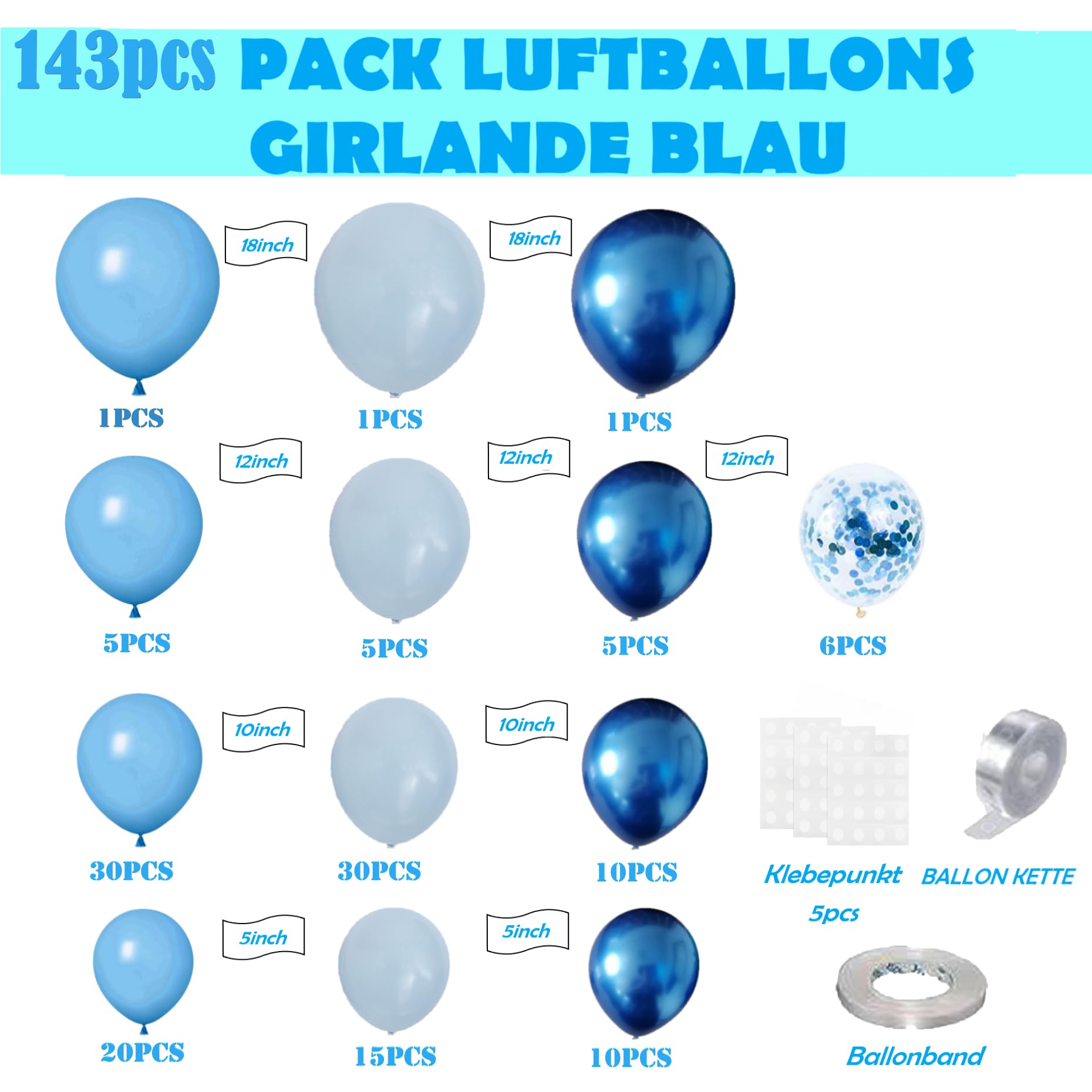Décorations Festives Éclatantes : Avec 60 ballons colorés, 16 Ballons Bleu Clair, 16 Ballons Bleu Foncé, 16 Ballons Blancs, 12 ballons transparents. Luftballons Blau Weiß Hellblau, 100 Stück 12 zoll Metallic Blau Helium Ballon, Blaue Konfetti Ballons, Latex Ballons, für Geburtstag Hochzeit Baby Shower Bayern Party Oktoberfest Deko Bayrische Deko 4,0 (41) 50 Mal im letzten Monat gekauft Faciles à gonfler et à accrocher, ces ballons en matériaux résistants sont conçus pour apporter une touche festive, que ce soit à l'intérieur ou à l'extérieur. Gardez-les loin des objets pointus pour éviter les éclatements. Ils peuvent être utilisés à l'intérieur comme à l'extérieur, et leur résistance garantit qu'ils resteront gonflés et beaux tout au long de votre événement. Grâce aux rouleaux de ruban fournis, attacher et suspendre les ballons devient un jeu d'enfant, vous permettant de vous concentrer sur la fête. Polyvalence pour Tous les Événements : Que ce soit pour un anniversaire, un baptême, un mariage ou une baby shower, ces ballons s'adaptent à toutes les occasions. Ballon Rose Et Bleu, 60 Pièces Ballons Bleu Et Rose Anniversaire... Assurez-vous de suivre les instructions de sécurité pour profiter pleinement de votre décoration. Luftballons Blau, 60 Stück Ballons Blau, Blaue Geburtstags Ballons Bleu Blanc Ballons Bleu Et Blanc Set, 60 Pièces Ballons Bleu Clair Ballons Helium Kit Ballons Avec Ruban Les teintes bleu clair et foncé, ainsi que les ballons blancs, apportent une touche élégante et festive à toutes vos célébrations. Avertissement De Sûreté Surveillance d'un adulte : Les ballons doivent être utilisés sous la surveillance d'un adulte pour assurer la sécurité des enfants. Risque de petites pièces : Les enfants de moins de 3 ans ne doivent pas toucher les ballons, car ils pourraient s'étouffer. Gonflage en toute sécurité : Utiliser une pompe à main ou un équipement à gaz adapté pour gonfler, et éviter de souffler directement avec la bouche. Élimination des déchets : Les ballons doivent être éliminés correctement après utilisation afin d'éviter toute ingestion accidentelle par les enfants.
