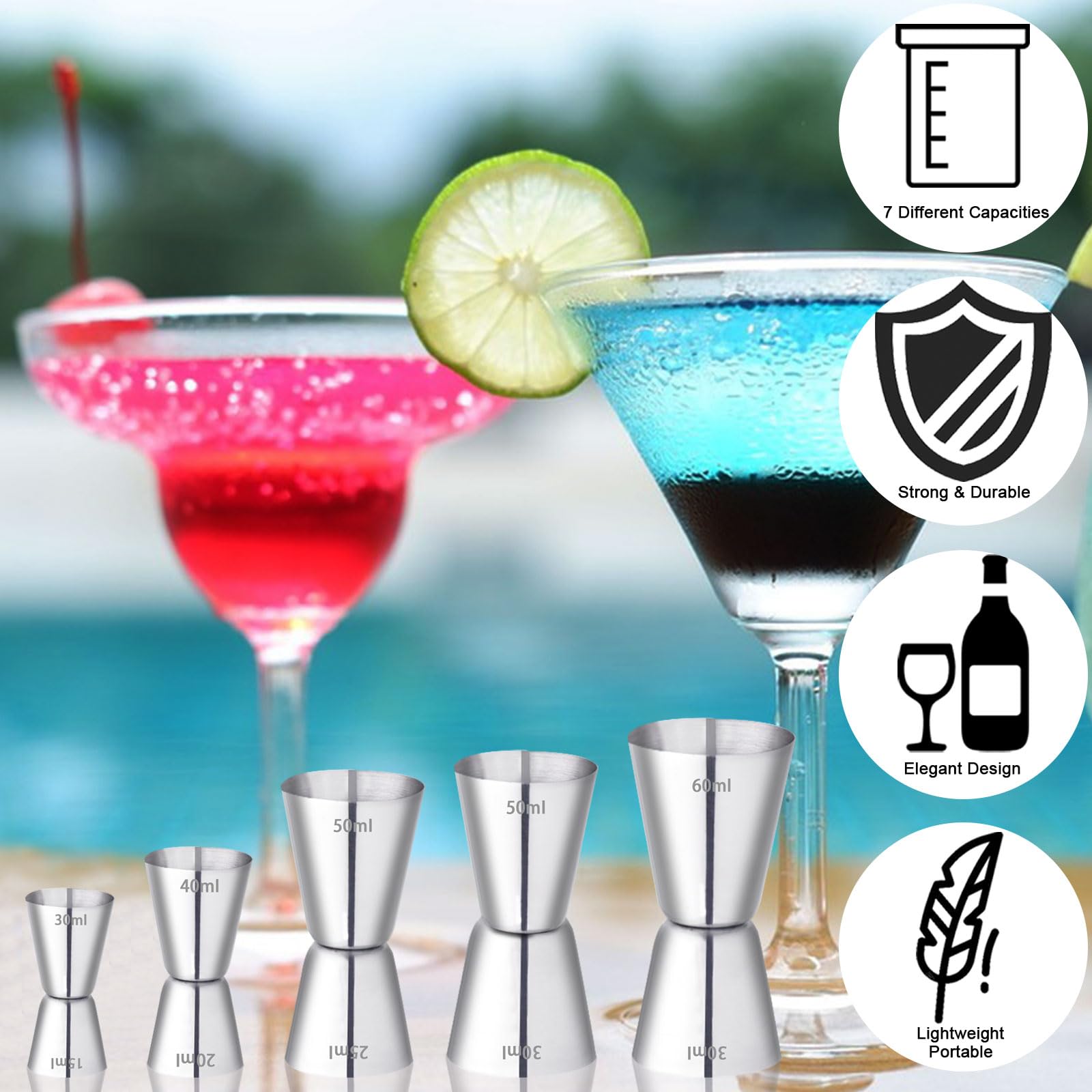 🍷【Facile à utiliser et à nettoyer】Doseur à cocktail en acier inoxydable avec des bords lisses, très facile à utiliser et à nettoyer, livrée avec un bec verseur en acier inoxydable pour verser facilement dans la mesure. 4 pièces de mesure à cocktail, mesure de bar en acier inoxydable 3cl/4cl/5cl/6cl, double mesure à gin avec 4 becs verseurs & 2 pinceaux. Le set de gobelets doseurs convient non seulement aux boissons alcoolisées, mais aussi à la préparation de cocktails et autres boissons mixtes VPAFPEKG 4 Pièces Doseur Cocktail 3cl 4cl 5cl 6cl, Jigger Verre Doseur Cocktail, Double Doseur à Cocktail en Acier Inoxydable avec 4 Becs Verseurs et 2 Brosses, pour Cocktail Bar Fête Vin Gin Shaker Cet ensemble de doseurs à cocktail est idéal pour une utilisation à domicile, dans les hôtels, les bars et autres lieux événementiels, et convient particulièrement aux barmen professionnels. La large ouverture de cette mesure facilite le remplissage et le versement sans renverser. Ces verres doseurs sont idéaux pour mesurer avec précision les cocktails, le scotch, le brandy, la vodka, le rhum, les jus ou autres boissons mélangées. Les becs verseurs s'adaptent aux goulots de bouteilles standard. 🍷【Set de verres doseurs à cocktail】Le set de verre doseur cocktail comprend 4 verres doseurs en acier inoxydable (15/30 ml, 20/40 ml, 25/50 ml, 30/60 ml), 4 becs verseurs et 2 pinceaux. Jigger Bar Double Face Set 4 Doseurs Cocktail Acier Inox - 3cl/4cl/5cl/6cl - Avec Becs Verseurs Jigger Double Face Il suffit de tourner le verre doseur pour verser le vin rapidement et avec précision. Spécifications: Couleur du produit: argent Taille: 15/30 ml, 20/40 ml, 25/50 ml, 30/60 ml Matériau: acier inoxydable Contenu du paquet: 4 x verres doseurs à cocktail 4 x becs verseurs 2 x brosses Le doseur à cocktail est un excellent accessoire pour les cocktails et un outil précieux pour les barmans. Comparez les prix pour Doseur pour cocktail. Affichez les offres et comparez les marchands avec leDénicheur St Germain Liqueur Verre Doseur à Cocktail 304 En Acier Inoxydable, Balance Intégrée, Cocktail Jigger Dual Spirit Doseur 3cl 4cl 5cl 6cl 🍷【Matériaux de haute qualité】Le doseur à cocktail en acier inoxydable est fabriqué en acier inoxydable de haute qualité.