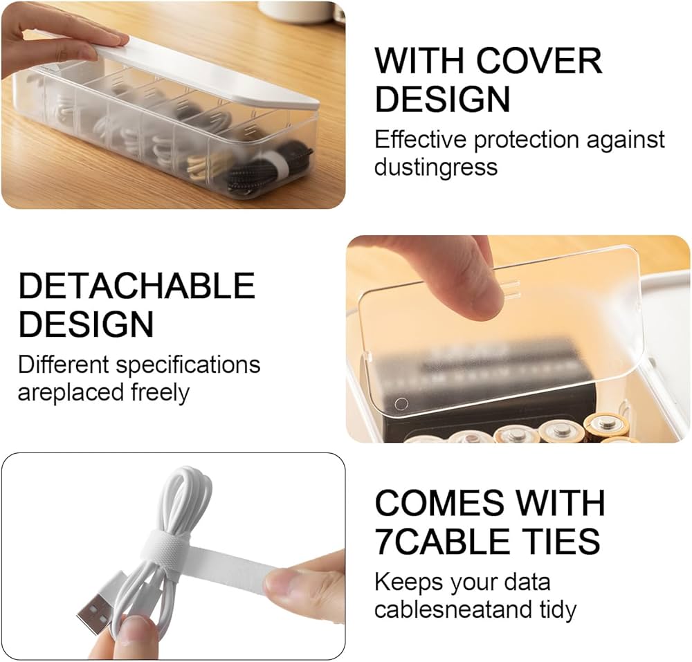 Gardez votre espace propre et bien organisé. Les séparateurs amovibles offrent une flexibilité totale pour adapter l’intérieur à vos besoins. Organiseur Câbles Séparateurs Amovibles SENENQU Lot De 2 Boîtes De Rangement De Câbles Blanches Avec Couvercle En Bois Pour Câbles Rangement Chargeurs écouteurs Bureau Rangement Cable YTACREA Cable Management Avec Bambou, Boite Pour Les Cache Compteur Electrique Design transparent pour une meilleure visibilité. Idéale pour le bureau, la maison ou la coiffeuse. 【Compartiments ajustables】 Dispose de 7 séparateurs amovibles pour organiser vos câbles, chargeurs et accessoires., Dimensions : 9×26×5 cm. 【Boîte de rangement multifonction】 Parfaite également pour ranger bijoux, maquillage ou fournitures de bureau. 20 Pièces Enrouleur Magnétique, Attaches De Câble Magnétiques... Parfaite pour la maison, le bureau ou la salle de classe. Fabriquée en ABS+PP de haute qualité, elle est transparente, solide et facile à entretenir. Idéale pour organiser des câbles de charge, écouteurs, fournitures de bureau ou bijoux.
