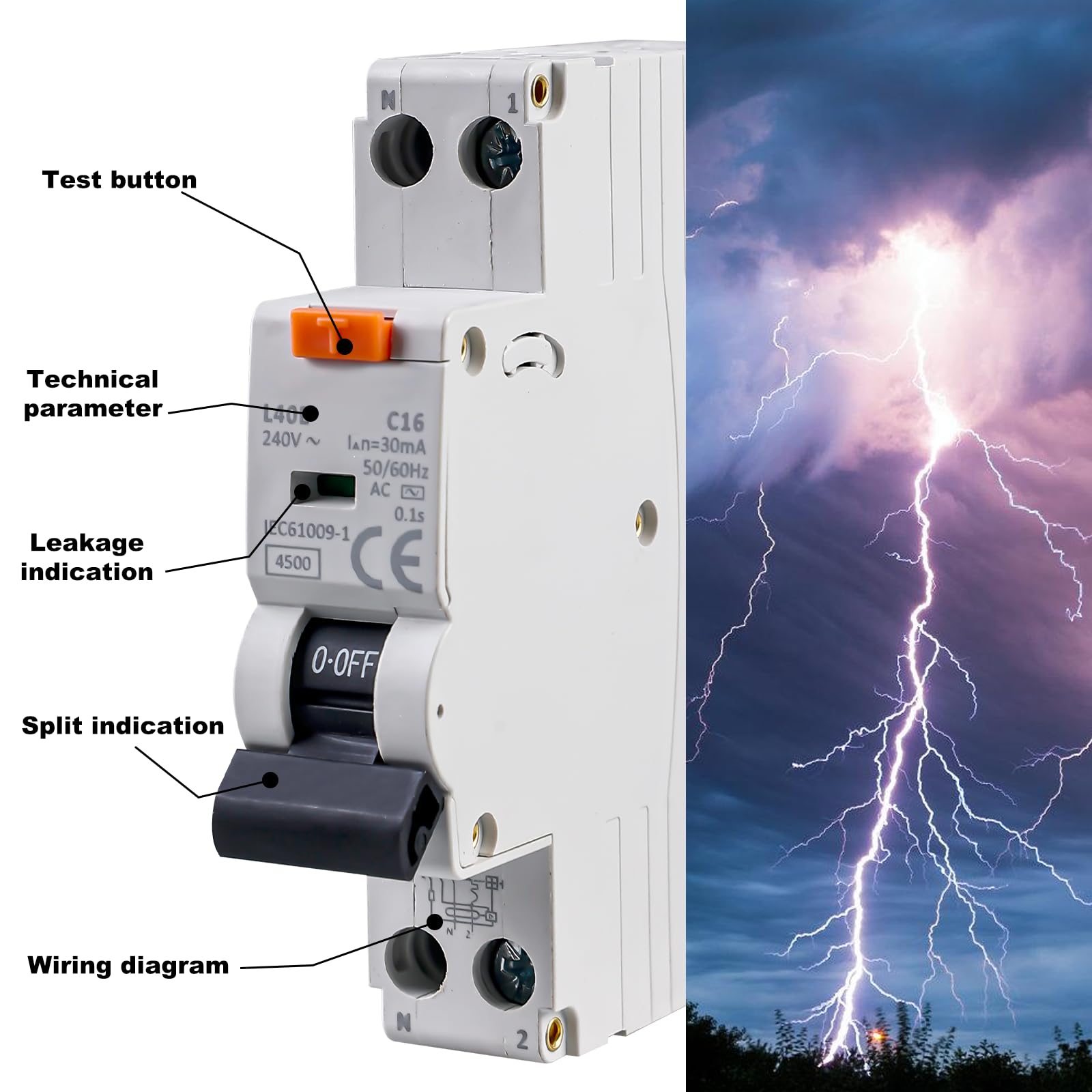 Interrupteur FI/LS - Disjoncteur Différentiel - 30 MA - 6 KA 1P+N - Type A C16/0,03 30 MA - GOMETY - Avec Disjoncteur RCBO 16 A - Courant Nominal RCD Protégé - 230 V - Type A - Montage Sur Rail DIN
