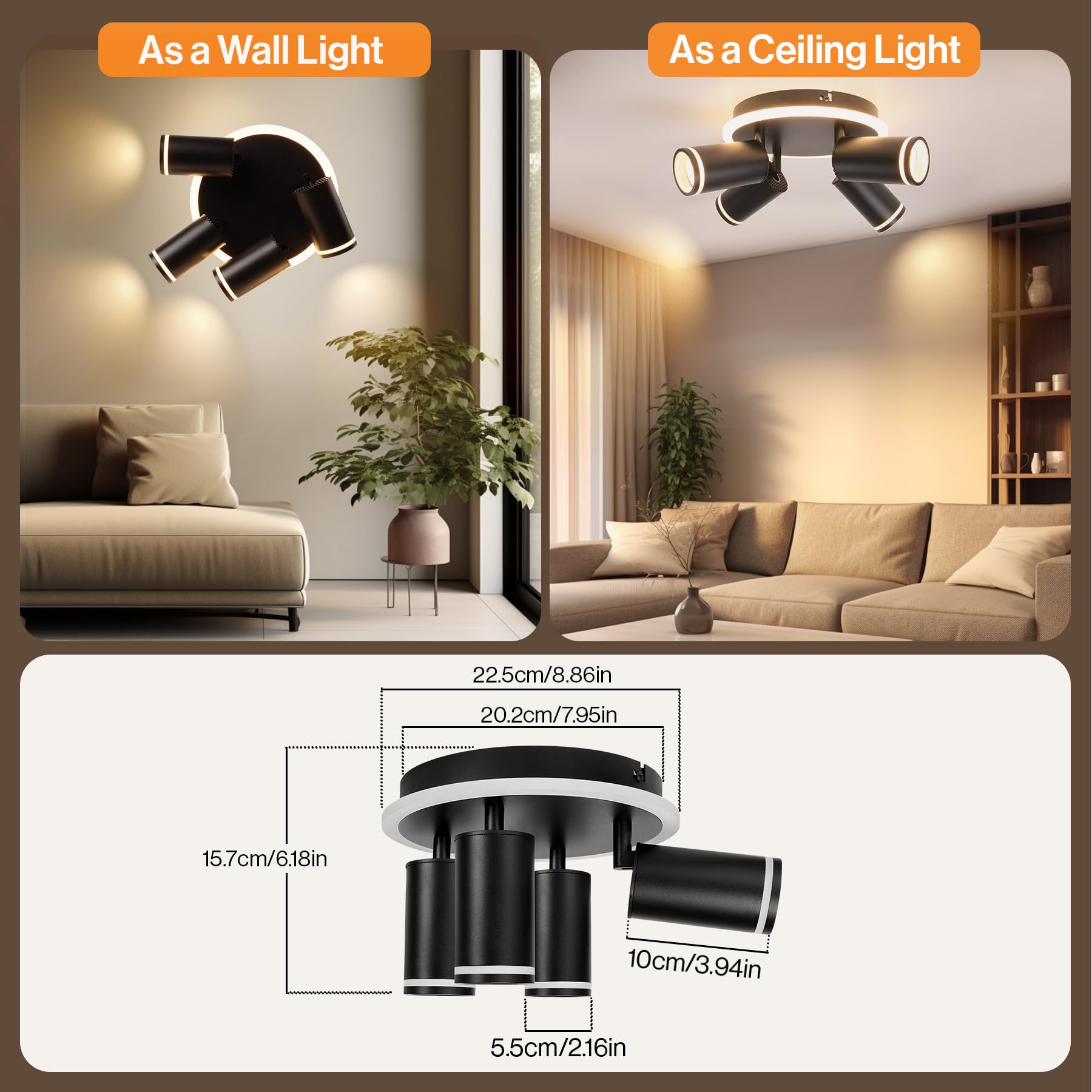 L'abat-jour est amovible, ce qui permet de le remplacer facilement par diverses ampoules GU10., Puissance : 10W maximum pour les ampoules LED. Ils peuvent à la fois éclairer la pièce et servir d'élément décoratif. Vous pouvez adapter l'éclairage à vos besoins et créer ainsi une ambiance lumineuse optimale. Douille GU10, ampoule incluse:Plafonnier spot avec douilles GU10, comprenant 4 ampoules LED GU10 de 5W, lumière blanche chaude 3000K. Spot LED plafonnier en cristal à bande chromée plafonnier boules Avec leur base annulaire lumineuse, leur tête pivotante et leur ampoule GU10 au choix, ces plafonniers offrent une grande polyvalence et s'adaptent à une multitude de styles de décoration. L'acrylique hautement transparent permet une diffusion uniforme et sans éblouissement de la lumière, créant ainsi une atmosphère douce et chaleureuse. Le plafonnier peut être incliné à 90° et pivoté à 350°, ce qui permet un angle d'éclairage illimité. Le plafonnier noir est livré avec des instructions d'installation détaillées et des accessoires. Éclairage flexible:La tête du Luminaire spot noir peut pivoter à 350° horizontalement et à 90° verticalement. Plafonnier Spot Orientable Noir pour 6 Ampoules GU10 - SILAMP Comparé aux spots de plafond traditionnels, il ajoute plus de profondeur et de dimension à la pièce. Il suffit de brancher la lampe sur une source d'alimentation de 230 V pour illuminer toute la pièce. La couleur donne au plafonnier une touche moderne et offre un joli contraste avec les plafonds.rotatif et pivotant : les stores sont cylindriques et peuvent être tournés à 355° à gauche et à droite et inclinés à 180° de haut en bas grâce à l'articulation, chaque douille peut être ajustée dans n'importe quelle direction pour... Créez votre propre éclairage pour créer une pièce accueillante et chaleureuse. Nouveau design - Éclairage par le bas:La base annulaire du spot plafond abrite une bande LED de 13W/1300LM, qui génère un éclairage indirect par réflexion sur la surface du plafond, produisant ainsi un effet d'éclairage uniforme et doux. Ce nouveau spot décoratif lumineux en acrylique, nouvelle décoration en acrylique à la base de ce plafonnier avec bande lumineuse LED 13W 1300LM intégrée, offre un éclairage agréable et des effets décoratifs. Applications étendues:Les Plafonnier 4 Spots conviennent à divers endroits tels que les cuisines, les salons, les chambres, les couloirs, les salles à manger, les bureaux, les hôtels et les salles de conférence, répondant à vos besoins d'éclairage dans différents scénarios. Plafonnier Noir Moderne Cuisine Salon Spot Plafond GU10, Plafonnier 4 Spots Noir, Plafonnier Spot Plafonnier 3 Spots Spot de Plafond Orientable URing Plafonnier 4 Spots Les spots rétro pour plafond intègrent des éléments modernes inédits et sont associés à des ampoules aux teintes chaudes. Le plafonnier pivotant peut être facilement installé sur les murs ou les plafonds. Grâce à son mécanisme pivotant flexible, ce spot de plafond s'adapte facilement aux besoins d'éclairage de différentes pièces comme les chambres, les cuisines et les couloirs. Nous le remplacerons gratuitement.