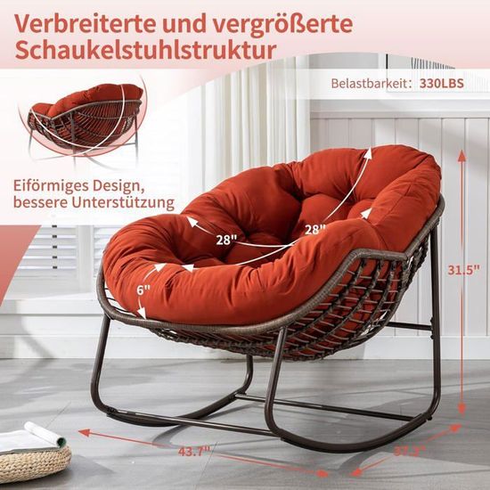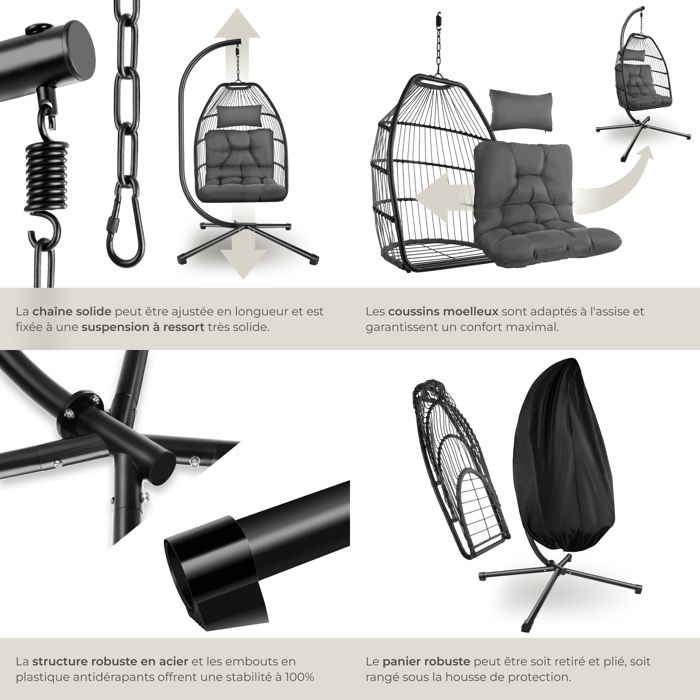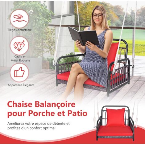 Idéal pour la cour, la véranda, le jardin, etc. Cadre en métal inoxydable et stable pour une grande stabilité. Cette balançoire polyvalente est idéale pour différents espaces extérieurs tels que la cour, la véranda et le jardin. Dimensions du coussin de dossier : 42 x 42 x 15 cm (L x l x épaisseur)., Charge maximale : 180 kg., Poids net : 7,5 kg. L'attention irréprochable aux détails de la chaise à bascule s'étend également aux coussins d'assise et de dossier, soigneusement conçus pour offrir une détente et un soutien optimaux. Grâce aux fermetures éclair souples, les housses de coussin sont également faciles à enlever et à nettoyer. Les cordes de suspension robustes et les crochets rendent la chaise à bascule sûre et stable. Profitez d'un confort sans fin : améliorez votre espace de détente et profitez d'un confort optimal avec ce siège à bascule pour terrasse. Caractéristiques techniques : Couleur du rotin : marron mélangé Couleur du coussin : beige/gris/blanc Matériau : métal, rotin PE, éponge, coton PP, tissu non tissé, polyester Dimensions totales (L x l x H) : 77 x 62 x 38 cm. Les coussins doux et douillets remplis d'éponge haute densité rendent le siège élastique et assurent une sensation d'assise agréable. Chaise Balançoire Rotin BOGATECO Fauteuil Suspendu Avec 2 Coussins | Supporte Jusqu'à 150 Kg Siege Suspendu Pour Interieur Et Exterieur Gris Fonce 93819573 Siège Hamac Extérieur FANTASK Siège Suspendu, Avec Cordes De Suspension, Coussins Et Cadre En Métal ... Pouvant Supporter Jusqu'à 180 Kg, Fauteuil à Bascule Pour Véranda, Jardin Hauteur du siège au sol : 35 cm. Fauteuil Suspendu Rotin Sur Pied En Résine Et Métal Noir Mojo... En outre, cette chaise à bascule simple peut supporter jusqu'à 180 kg. Installation facile : la chaise à bascule est livrée avec des accessoires complets et des instructions claires, de sorte que l'installation est simple. Contenu : 1 siège suspendu pour véranda., 1 coussin d'assise., 1 coussin de dossier. Siège Suspendu En Toile De Coton Fauteuil Suspendu Chaise Hamac,Style 3 Dimensions du coussin d'assise : 57 x 53 x 4,5 cm (L x l x épaisseur). Le rotin synthétique élégant est également durable. Plage de hauteur de suspension appropriée : 1,8 à 2,25 m. Spécifications: Assise confortable avec coussins d'assise et de dossier doux.