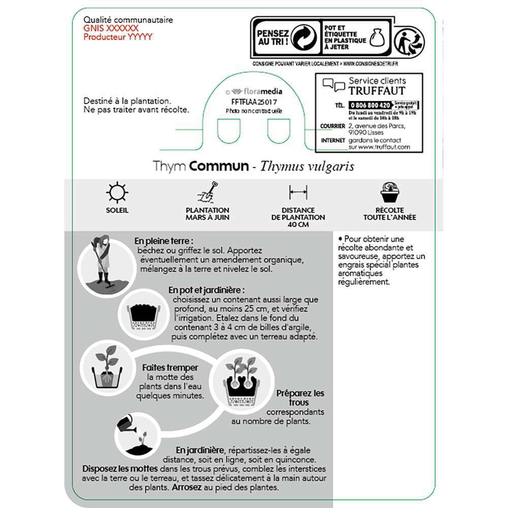 Le thym commun est une variété de petite taille, allant de 20 à 40 cm de hauteur. DATE DE LIVRAISON DÉPENDANT DES CONDITIONS MÉTÉOROLOGIQUES En cuisine ou comme plante médicinale, cultivez le thym pour de nombreux bienfaits. Vous pouvez tout à fait le repiquer en pleine terre ou le garder en pot sur le rebord d'une fenêtre afin d'en disposer comme vous le souhaitez. Thym commun - Vente en ligne de plants de Thym commun pas Caractéristiques : - Envoyé dans un emballage spécialement étudié pour le transport des plantes qui garanti une expédition sécurisée, contenant 100% recyclé et recyclable - pot carré d'un format de 11 cm de côté (l'équivalent d'un pot de 1,5 litres de terreau) - plants d'excellente qualité avec un arrivage chaque semaine depuis une pépinière Thym commun plante ab pot 1l - plant d'aromatique du jardin | Truffaut Thym Cuisine Médicinal Thym Commun - Pépinière Les Vagabondes à Catus Dans Le Lot, Près De Cahors Thym Vivace Médicinal Potager Le thym commun a besoin d'un sol bien drainant et d'une exposition bien ensoleillée. Il peut atteindre 1 mètre de diamètre et 20 à 30 cm de haut au moment de la...