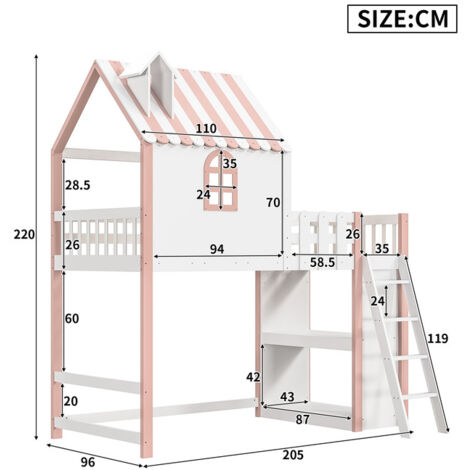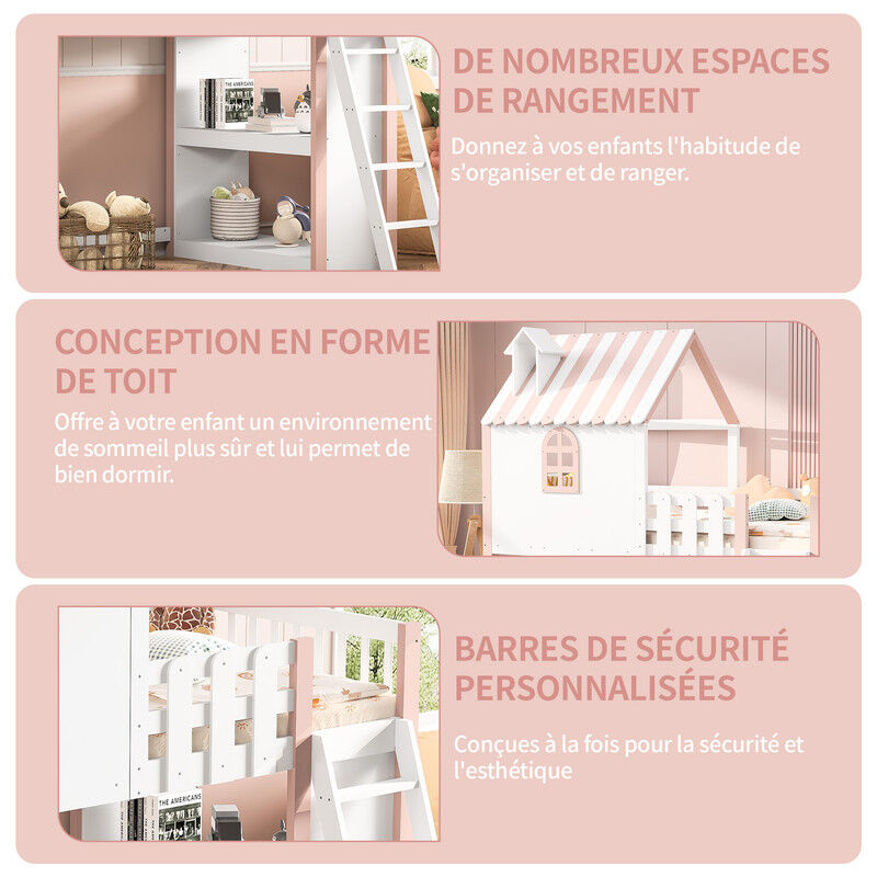 Informations sur le produit : Couleur principale :Rose/Vert Matériau principal : bois de pin + contreplaqué + MDF Style du produit : moderne Type de produit :Lit enfant Pays d'origine : Chine Capacité de poids du lit : 120kg Taille du produit : lit mezzanine 90x200 :208 x 102 x 218., 5cm 52kg Convient à la taille du matelas:90x200cm Recommander l'épaisseur du matelas : 8-10cm Remarque : ✅Toutes les dimensions sont approximatives,Des erreurs de 2 à 3 cm peuvent se produire. Lit Cabane Enfant Fermé "Amori" 90x200cm Blanc ✅Ce produit ne comprend pas de matelas ✅Nos produits sont accompagnés d'instructions de montage claires pour une installation rapide et facile. Son design ergonomique facilite l'accès, même pour les enfants, tandis que la profondeur généreuse des marches réduit les risques de glissade. Design Sécurité : Fabriqué en bois massif de pin pour le cadre et en panneaux de fibres moyenne densité (MDF) de haute qualité pour la finition, garantissant sécurité et durabilité. Lit Enfant Toit Et Fenêtre Lit Enfant 90x200cm, Pin + MDF, Lit Mezzanine Avec Tiroirs Et Bureau Escalier Avec Rangement Sans Matelas Blanc Naturel 85718566 Lit Cabane Afin de réduire le risque de dommages pendant le transport, nos lit mezzanine enfant sont expédiés en 3 colis qui peuvent ne pas arriver en même temps le même jour, alors soyez patient et vérifiez que tous les accessoires sont complets avant l'assemblage. Multifonctionnel avec Espace de Jeu et de Rangement : Ce lit cabane enfant offre non seulement un espace de sommeil confortable mais aussi un espace de jeu spacieux sous le lit. Il comprend plusieurs compartiments de rangement intégrés où les enfants peuvent ranger leurs affaires, optimisant ainsi l'utilisation de l'espace. Jolies couleurs : Ce lit enfant au design unique s'inspire des couleurs vives des glaces, associées à une forme de toit amusante. Lit superposé cabane - échelle - 90x200cm - pin massif - Gris - Sweiko Les couleurs vives ajoutent une touche de gaieté à la chambre à coucher. Jolies couleurs : Ce lit enfant au design unique s'inspire des couleurs vives des glaces, associées à une forme de toit amusante