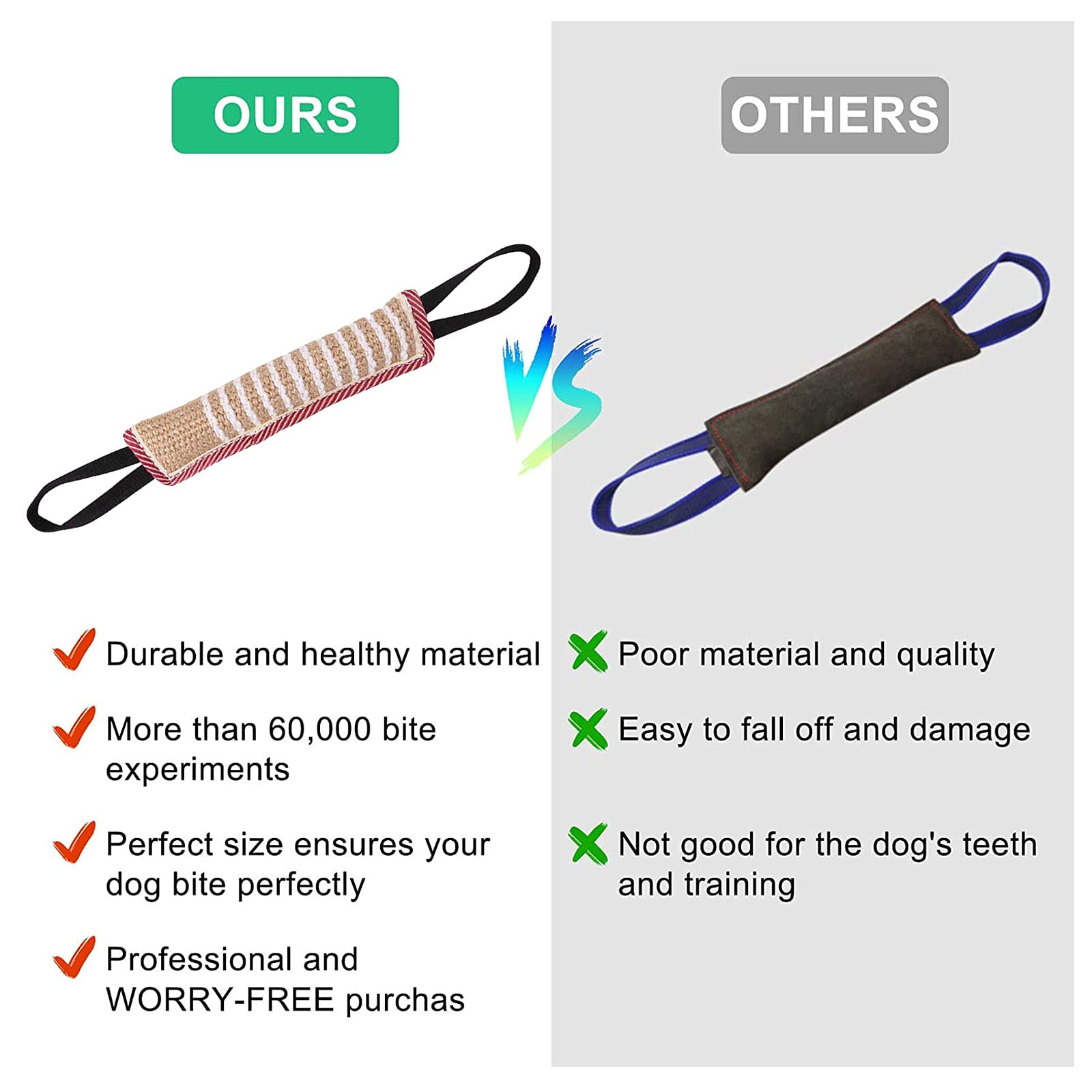 Conçues pour être confortables et résistantes, ces poignées améliorent votre expérience interactive avec votre chien, rendant l'entraînement facile et agréable Julius-K9 18145 Boudin À Mordre En Jute Avec 2 Anses, 45 X 7 Cm[u1434 Ce coussin de dentition mesure 30 cm de long. Il constitue un excellent jouet de récompense et d'exercice pour une utilisation à l'intérieur comme à l'extérieur. Le bâton à mâcher pour le dressage des chiens aide à distraire votre chien, minimisant ainsi le fait qu'il mâche les meubles et autres objets afin de protéger votre environnement domestique. Ce jouet à mâcher réduit efficacement la tendance de votre chien à endommager les objets ménagers. C'est un choix idéal pour entraîner l'agilité canine. Jouet pour Chien - Mordre Jute - Extra Robuste - 2 Poignées - Gants de Protection - Tirer Corde Chaque jouet à tirer est doté de deux poignées souples mais robustes, qui s'adaptent à différentes positions de la main pendant l'entraînement. Le pudding à mâcher pour chien est un jouet interactif basé sur la récompense, adapté au jeu à l'intérieur comme à l'extérieur. Mode d'emploi Le jouet à mâcher pour chien mesure 30 centimètres de long, une taille parfaite pour une prise en main facile pendant les jeux interactifs. Quand les saucisses commencent à mordre Lot De 2 Saucisses À Mordre Pour Chiens, Saucisses À Mordre En Jute K9 Dentrainement Avec 2 Poignees Jeux De Tir A La Corde Et De Traction Avec Chiens Jouet A Mordre Pour Chien Jouet Robuste Pour Chien Informations sur le produit: Nom du produit : Ensemble de jouets pour chiens Caractéristiques : Sûr, résistant à l'usure, durable Matériau : Coton-jute/TPR Dimensions : 30 cm Remarques: 1., Les couleurs des éléments peuvent légèrement varier par rapport aux images en raison de l'éclairage et des paramètres de l'écran., 2., Prévoyez des variations mineures de taille dues à la mesure manuelle.