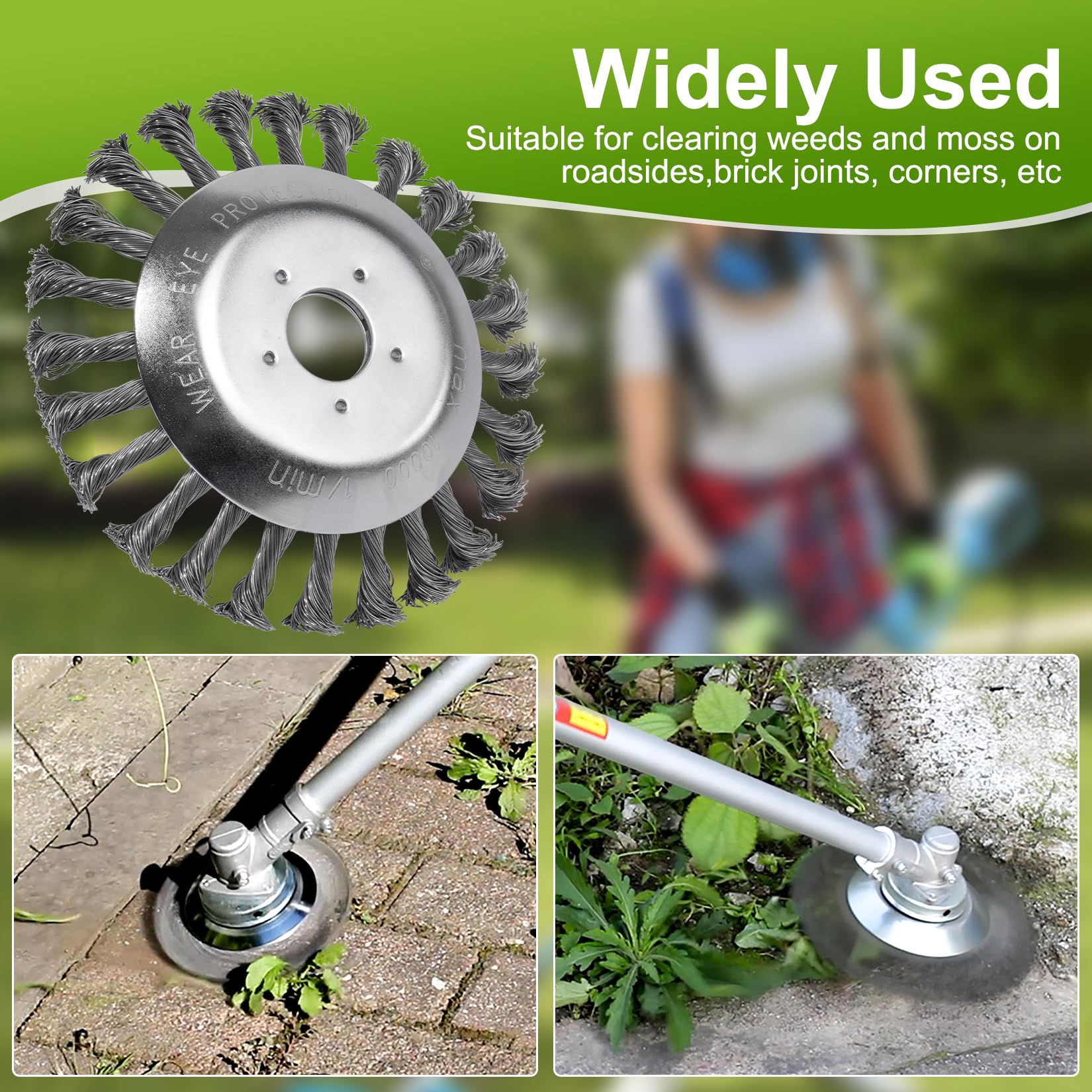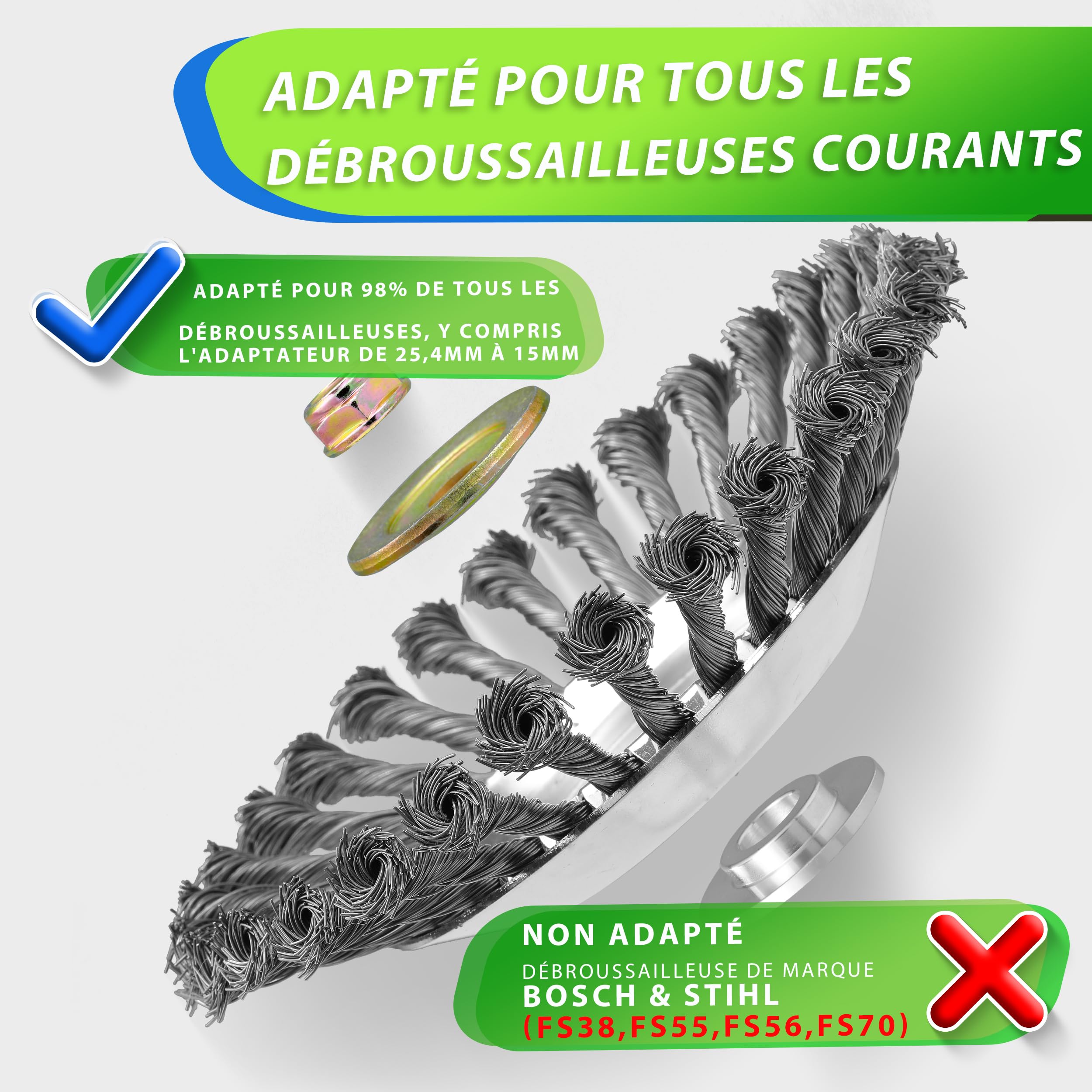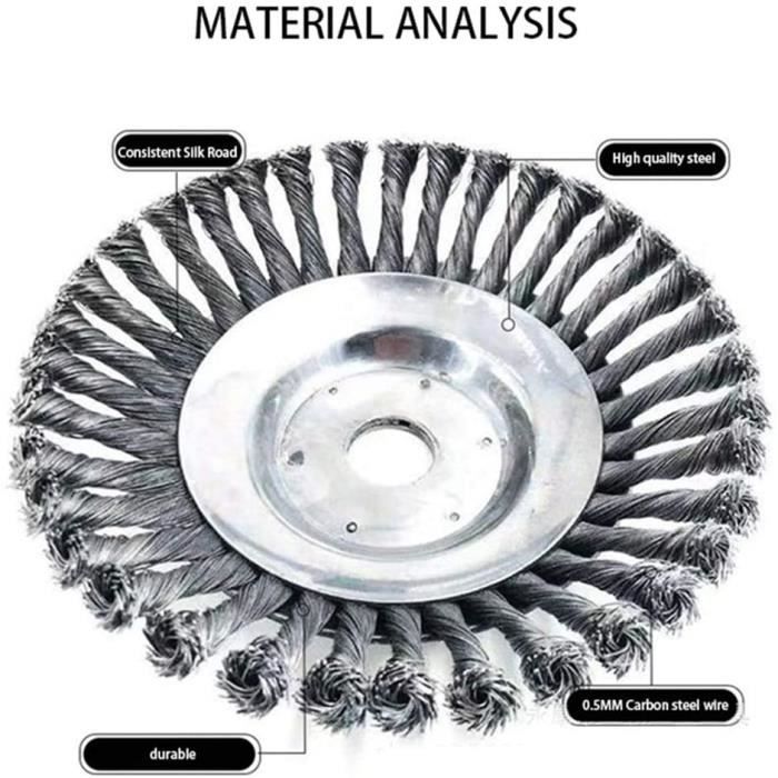Tête Brosse Désherbage 200x25.4mm Brosse de Débroussailleuse à Gazon Disque Debrouissalleuses Lot De 2 Pièces Brosse Metallique Debroussailleuse,avec Accessoires,Brosse De Desherbage Diamètres 150 Et 200 Mm,Taille Du Trou 25,4 Mm | Leroy Merlin Brosse Pour Débroussailleuse Compatible avec la plupart des débroussailleuses, elle permet d'éliminer rapidement et facilement les mauvaises herbes, la mousse et les herbes sauvages des bordures d'allées, des joints de briques, des coins, etc. Matériau haute résistance : La brosse de désherbage est fabriquée en fil d'acier de haute qualité offrant une excellente résistance à l'usure et à la flexion. Les dents de blocage du fil empêchent le fil de glisser pendant l'utilisation. Brosse désherbage ø170-190-200mm pour débroussailleuse Cela permet d'éliminer efficacement la mousse et les mauvaises herbes de la chaussée et des joints peu profonds. Cette tête de coupe est faite de fils d'acier torsadés avec 36 lames de brosse. Elle est spécialement conçue pour les travaux simples, rapides et faciles, ou pour les travaux nécessitant une injection de puissance turbo Installation facile : Fixez simplement la brosse métallique au boulon supérieur de la tondeuse droite et fixez-la avec des rondelles et des écrous. Nettoyage efficace : La brosse métallique est équipée de 30 bobines de fil.