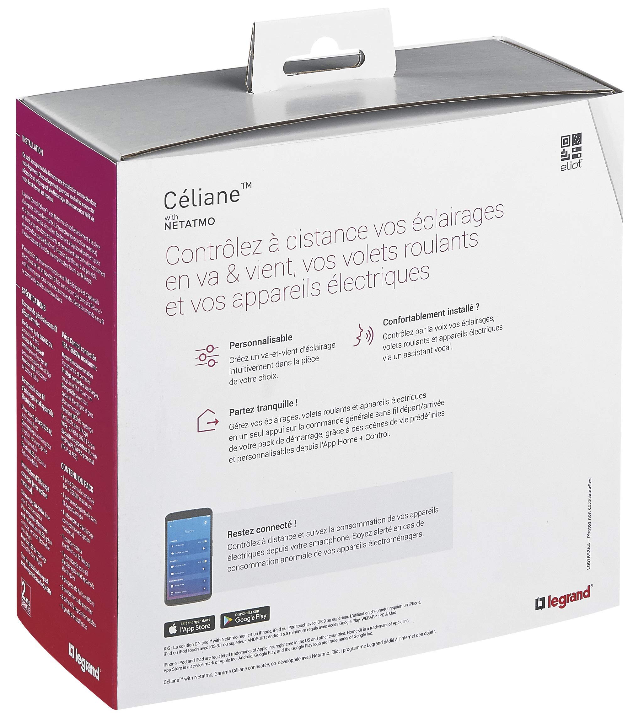 Préparez-vous à gérer éclairages, volets roulants et appareils électriques de manière intuitive et moderne. Le pack de démarrage pour installation connectée permet de contrôler à distance vos éclairages, volets roulants, appareils électriques via l'App Home Control ou à la voix, suivre la consommation de vos appareils depuis votre smartphone Interrupteurs ultra-pratiques, prises fiables et adaptées aux besoins du quotidien, dispositifs connectés… tous les produits Legrand sont conçus pour favoriser le développement durable et la transformation numérique des bâtiments, en mettant l'accent sur l'innovation, la sécurité et l'efficacité énergétique. INDISPENSABLE ET PERSONNALISABLE : Ce kit à installer impérativement pour démarrer toute installation connectée dooxie with Netatmo peut être complété par des kits et produits connectés supplémentaires en fonction de vos besoins. Tels sont les piliers de notre engagement. LEGRAND, 150 ANS D'INNOVATION : Simplifier la vie, assurer confort et sécurité, favoriser l'efficacité énergétique., ., ., tout en préservant l'environnement et en contribuant à la transformation numérique. Le Kit de Démarrage dooxie with Netatmo constitue une solution idéale pour entrer dans l'ère de la maison connectée. Commande sans fil pour éclairage ou prise connectée - Dooxie with SIMPLICITÉ D'INSTALLATION : Chaque produit est livré complet, prêt à poser*, avec support, enjoliveur et plaque de finition. La gamme dooxie propose un large éventail de fonctions pour l'éclairage, le chauffage, l'alimentation et la gestion des volets. KIT COMPLET POUR INSTALLATION CONNECTÉE : Ce kit se compose de quatre produits essentiels : 1 prise électrique Control, 1 commande générale sans fil Départ/Arrivée, 1 interrupteur avec option variateur, 1 commande sans fil pour éclairage et prise. Legrand propose un pack qui vous permettra de créer une installation connectée dans votre logement. Vous pouvez compléter votre installation avec des prises, interrupteurs, micromodules d’éclairage et commandes sans fil Dooxie with Netatmo Legrand 600670 | Pack de démarrage dooxie with Netatmo prise Control + cde Départ/Arrivée - blanc | Commande et automatisme radio | Automatisme du bâtiment | Appareillage et contrôle du bâtiment | France Facile à installer* et à configurer, il transforme votre logement en environnement intelligent, connecté et contrôlable à distance.