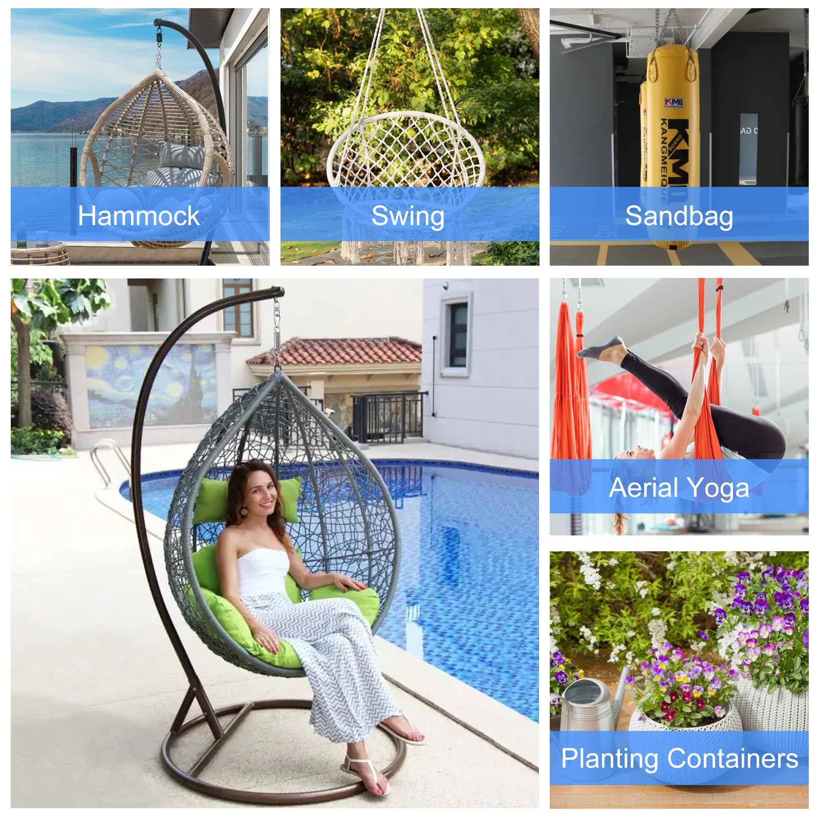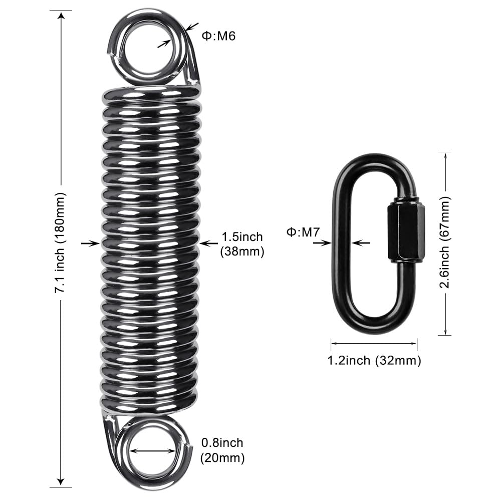 Ressorts de chaise hamac - l'ensemble de ressorts de balançoire pour chaise suspendue permet un balancement doux et confortable, en se balançant et en tournant tout en voyant votre suspension en absorbant les chocs, le ressort de balançoire et les anneaux Ressort de hamac en métal - le kit de ressort oscillant est stable et, et le ressort peut sauter avec l'amplitude, se ou tourner confortablement, afin que le corps humain puisse se détendre, kit de suspension de chaise hamac Anneaux à ressort pour hamac - vous pouvez voyager, visiter la plage, camper en tente ou simplement vous divertir en famille avec ces accessoires sur hamacs, ressort de chaise pivotante Balancement Doux Intérieur Extérieur Kit De Suspension Pour Chaise Hamac,Crochet Robuste Avec Chaîne Pour Intérieur Et Extérieur,Sac Accessoire Pour Chaise Suspendue Ressort oscillant : avec une finition détaillée, l'ensemble de ressorts de balançoire joue le rôle de ressort de balançoire extérieur, de ressort de chaise de hamac Description du produit Description : nos ressorts pivotants sont fabriqués en acier au carbone de qualité supérieure, ce qui peut fournir une expérience de suspension stable, lisse et sûre pour une variété de scénarios intérieurs et extérieurs, tels que les chaises hamac, les balançoires de porche, les chaises à bascule, les sacs de sable, les balançoires extérieures et le yoga... CAXUSD 1 ensemble d'accessoires de chaise balançoire à ressort, sac de sable à ressort, kit de ressort robuste pour fixation de hamac à ressort, anneaux de suspension pour hamac