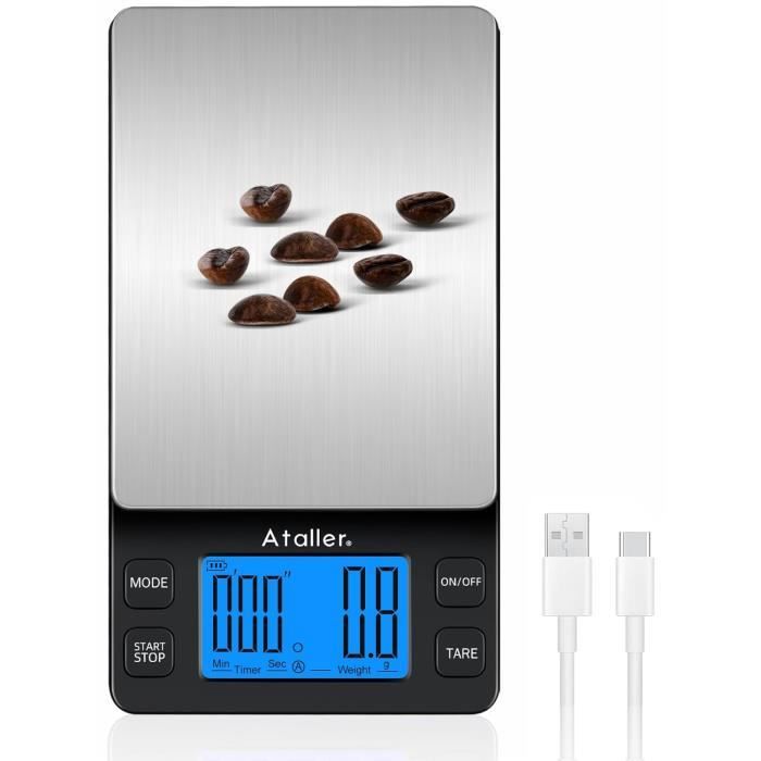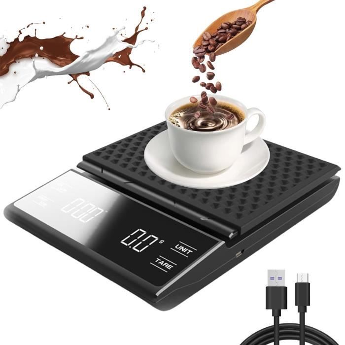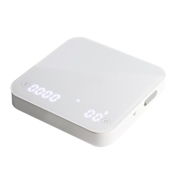 La balance passe en mode veille après 5 minutes d'inactivité. Unités Multiples et Modes Flexibles : Choisissez parmi trois unités (g/oz/ml) et quatre modes (PR1/PR2/E1/E2) pour un usage polyvalent et un ajustement facile aux besoins spécifiques de votre préparation. Balance à café électronique numérique 3kg, Pour al... – Grandado Précision de Pesée Exceptionnelle : Cette balance à café offre une précision de 0,1 g et une plage de mesure allant de 0,5 g à 5000 g, permettant une pesée précise des moutures de café et des ingrédients avec des résultats fiables Conception Ergonomique et Matériaux Durables : Fabriquée en ABS de haute qualité, cette balance est équipée d’un écran LED et de boutons tactiles dissimulés, offrant une expérience utilisateur moderne et agréable. Fdit Balance de cuisine Balance à café électronique Balances de cuisson Remarques :Dans l'interface de pesée normale, appuyez quatre fois rapidement sur le bouton TARE pour activer/désactiver le son. Placez la balance sur une surface dure et plane pour éviter les coussinets souples ou les zones inclinées qui pourraient entraîner des erreurs de mesure. Balance Cafe Espresso Balance À Café, Balance De Cuisine Numérique Étanche Électrique Avec Balance De Cuisine Rechargeable Alimentation Double : Profitez d'une batterie lithium rechargeable de 500 mAh et de trois piles AAA incluses. Précision de Pesée Exceptionnelle : Cette balance à café offre une précision de 0,1 g et une plage de mesure allant de 0,5 g à 5000 g, permettant une pesée précise des moutures de café et des ingrédients avec des résultats fiables. Fonction Ratio Eau/Poids Intelligente : Équipée d'une fonction intelligente pour mesurer le ratio eau/poids, cette balance permet un contrôle professionnel des concentrations d'extraction du café, garantissant une préparation parfaite à chaque utilisation.