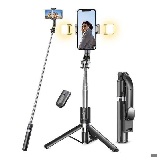 Vous décidez du niveau d'intensité lumineuse : la lumière blanche est réglable sur 3 niveaux. CNMTCCO Perche à selfie trépied avec 2 lumières de remplissage, trépied extra long de 130 cm avec télécommande sans fil amovible pour filmer, compatible avec iPhone, Samsung, smartphone, etc Cet anneau doté d'une lumière LED circulaire se fixe sur le dessus du smartphone à l'aide d'un clip. Une fois déchargé, connectez-le à une source d'alimentation via le câble USB-Micro-USB inclus. Pour les smartphones jusqu'à 6 (extension de la pince : 55mm à 85mm) Télécommande avec une portée de 10 mètres Exprimez votre créativité et créez des atmosphères uniques. Trépied universel télescopique SBS Il existe de nombreuses combinaisons possibles : appuyez une fois sur le bouton pour choisir celle qui convient le mieux à vos vidéos et selfies. En outre, grâce à sa conception spéciale, la caméra frontale reste libre. Appuyez sur le bouton et maintenez-le enfoncé pendant quelques secondes pour activer la lumière de couleur. Le déclencheur est amovible et devient ainsi une télécommande sans fil fonctionnelle jusqu'à à 10 mètres de la perche à selfies. EXTENSIBLE ET ORIENTABLE La perche est extensible jusqu'à 70 centimètres : vos selfies avec des paysages ou des monuments de fond seront toujours parfaits Perche à Selfie Trépied Selfie SBS Avec Télécommande - Tige Extensible 70 Cm - Compatible Smartphones Jusqu'à 6" Accessoire Photo Kit Selfie Voyage Compact En cliquant sur le bouton approprié, vous activerez lalumière blanche, qui est très utile pour donner facilement à vos créations de l'éclat.