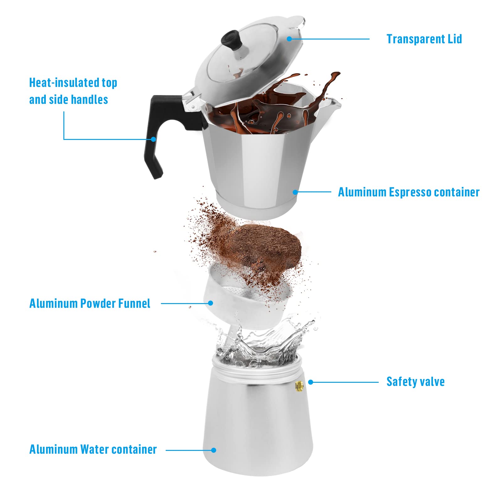 Plaque Chauffante 500W Jerool Plaque De Cuisson Simple De 500 W Et Combinaison De Machine à Plaque Chauffante électrique 500W La poignée ergonomique et profilée protège contre les brûlures, tient confortablement et en toute sécurité dans la main et permet un transport sûr et confortable. Plaque de cuisson adaptée à tous les types de casseroles Plaisir de café pour jusqu'à 3 personnes Réglage en continu de la température Surface de chauffage... Bialetti Machine à Expresso "Moka Express Diamètre du fond de la cafetière : 9,8 cm. Le design géométrique classique ajoute une touche supplémentaire d'esthétique et de style à votre intérieur. Plaque de Cuisson électrique1000W GENERAL GOLD A300 Chauffage puissant et rapide : équipé d'une grande plaque chauffante en fonte et d'une puissance élevée de 500 W, l'appareil offre une excellente efficacité de transfert de chaleur et atteint rapidement la température d'infusion idéale, vous permettant de profiter immédiatement du goût intense du café italien. Données techniques : Modèle : YQ-105., Couleur : argenté, noir. Dimensions de l'emballage : 34 x 12 x 12 cm. Dimensions de la cafetière (L x H) : 12 x 16 cm. Diamètre de la plaque chauffante électrique inférieure : 13,5 cm/5,31 pouces Hauteur de la plaque chauffante électrique : 7,5 cm. 1 manuel d'utilisation en anglais. Contenu de l'emballage : 1 verseuse à café. Matériau : alliage d'aluminium, fer, silicone Tension de la plaque électrique : 220-240 V, 50/60 Hz Puissance de la plaque électrique: 500 W Capacité de la cafetière inférieure : 150 ml/5 oz Prise : norme européenne.