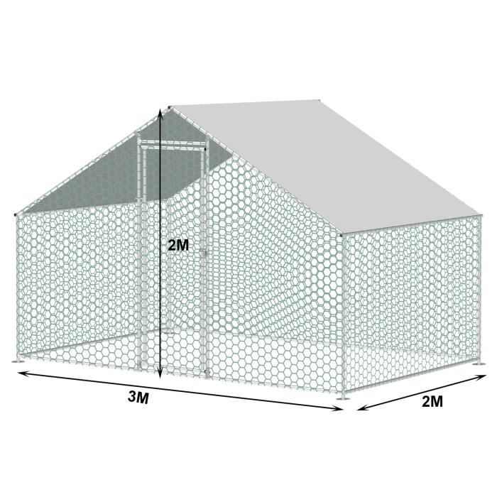 Porte simple, dimensions du tube de porte : 25 x 0,65 mm Dimensions du poulailler : 3 x 6 x 2 m (longueur x largeur x hauteur). La porte est équipée d'un loquet pour garder vos animaux à l'intérieur. Vous pouvez verrouiller de l'intérieur pendant que vous nourrissez et rangez le panier. Le poulailler offre une protection pour vos animaux de compagnie et beaucoup d'espace pour la recherche de nourriture. De petits espaces entre les grilles augmentent la sécurité de vos poules et les protègent de certains prédateurs. Enclos Volailles Acier Galvanisé Poulailler 10 Poules VidaLife - Poulailler En Acier Pour Poulailler - Enclos Poulailler Xxl Enclos Extérieur Poules Canards Construction en acier durable : poulailler fabriqué à partir d'un cadre en acier de haute qualité. Facile à nettoyer : le poulailler se nettoie facilement avec un chiffon humide ou un peu d'eau courante. Ce poulailler est facile à installer, les pièces sont reliées entre elles par des boutons à ressort. Treillis métallique hexagonal recouvert de PVC : le poulailler est fabriqué en treillis métallique hexagonal revêtu de PVC, solide et durable. Notre poulailler pratique et spacieux est le choix parfait comme enclos extérieur pour vos poules, canards et autres petits animaux, les protégeant en toute sécurité et confortablement. Fabriqué à partir d'acier galvanisé de haute qualité, il offre solidité et durabilité Le toit en PVC est résistant à l'eau et aux UV et protège contre les coups de soleil, la pluie, la neige, la grêle et d'autres conditions météorologiques. Aucun outil supplémentaire n'est nécessaire pour l'ensemble de la commande de décoration. Le poulailler est livré avec un socle, ce qui en fait la maison idéale pour toutes les volailles. Les parois latérales en treillis métallique galvanisé sont solides et peuvent prévenir les mauvais comportements ou autres accidents tout en maintenant la ventilation. EN STOCK : Poulailler Enclos Extérieur Volière Cage pour Animaux avec Serrure Armature Acier Galvanisé Poulailler Chenil (3 x 6 x 2 m) NAIZY, HAG8438D HAG8439E pas cher. Livraison rapide partout en France Enclos Poulailler Anti UV 3 X 6 X 2 M Avec Serrure Toit Etanche Et Resistant Au Soleil Acier Galvanise Pour Utilisation En Exterieur 18m2 98752490 1 bâche de protection contre le soleil/la pluie avec œillets et élastiques à boules., matériel de montage