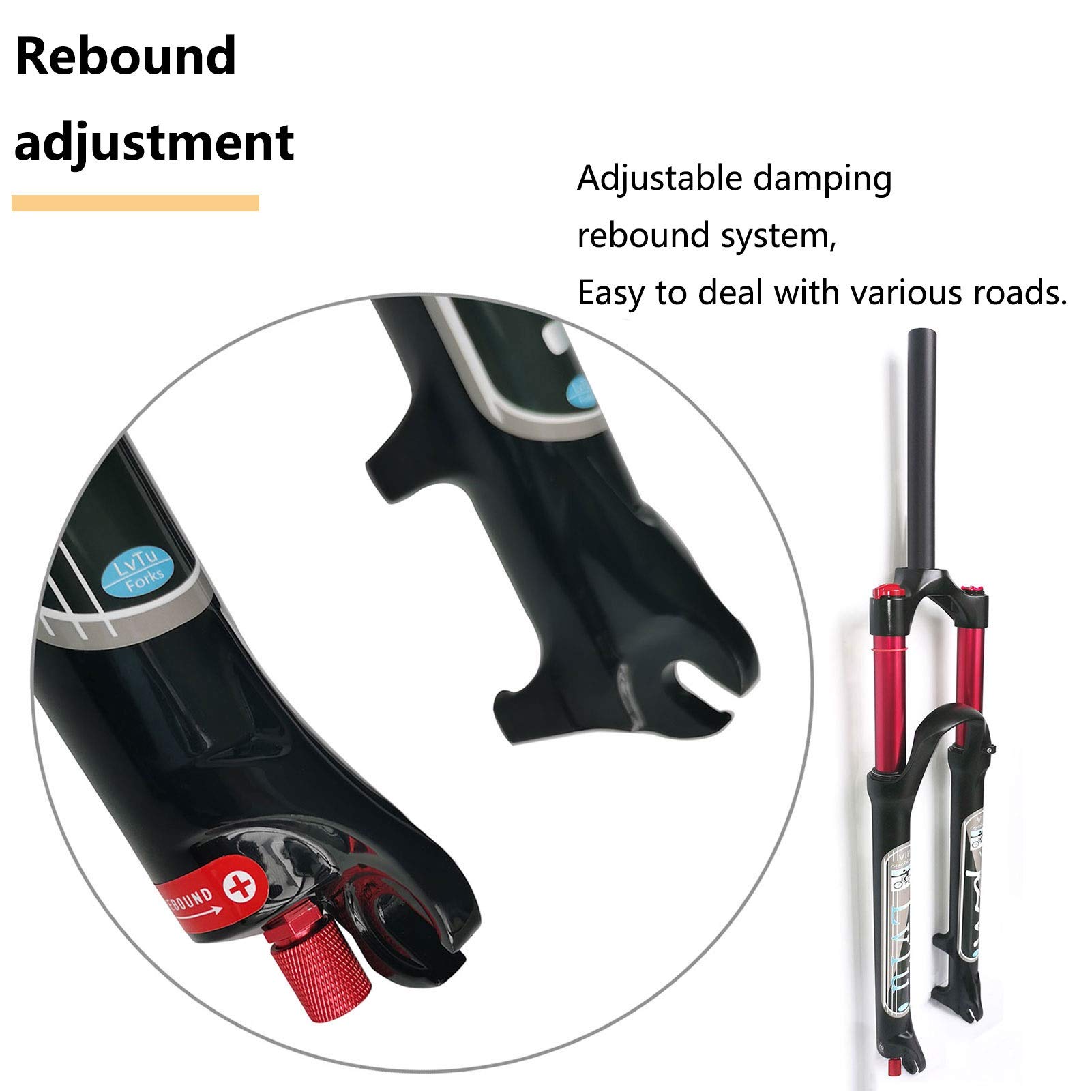 LvTu 26/27.5/29 Pouces Fourches Avant Vélo de Montagne Voyage 120mm, Fourche VTT Air avec Ajusteurs de Rebond QR 9mm (Color : Tapered Manual Lock Out, Size Il peut être aussi rapide qu'un lapin ou aussi lent qu'une tortue sous votre réglage, que ce soit en montagne ou hors route / XC, nid-de-poule ou terrain doux, ce qui vous apporte la conduite la plus confortable et la plus pratique. Fourche Axe QR 9mm LvTu Vélo De Montagne Suspension Fourche Avant Air VTT 26 27,5 29 Pouces Voyage 140mm Amortisseur QR 9mm Vélo Accessoires (Color : Straight Remote Lock Out, Size : 27.5 Inch Fourche Vtt Avec Roue ❤ DESCRIPTION DE LA FOURCHE VTT:- Nom: fourche de suspension de vélo- Catégorie SOURCE: Spot- Marque: LVTU- Modèle: LVTU-120-9x100-QR- Catégorie: Amortisseur d'air- Taille: 26 / 27,5 / 29 pouces- Course de la couronne: droite - 28,6x30x220 mm, conique - 28,6x39,8x220 mm. ❤ TAILLE: 26 / 27,5 / 29 pouces, tube intérieur: 32 mm, axe: 9x100 mm (QR). ❤ MATÉRIEL: alliage de magnésium et alliage d'aluminium de haute qualité. Il peut être aussi rapide qu'un lapin ou aussi lent qu'une tortue sous votre réglage, que ce soit en montagne ou hors route / XC, nid-de-poule ou terrain doux, ce qui vous apporte la conduite la plus confortable et la plus pratique Vélo de montagne Fourches, 26/27.5/29 pouces VTT Vélo Fourche avant - Convient pour: 26 / 27,5 / 29 pouces Mountain / XC Offroad bike, VTT, vélo de frein à disque- Convient pour: pneus 26 / 27,5 / 29 x 1,5-2,45 - Poids: environ 1640g - 1750g- Couleur: chambre à air orange / or❤ SPÉCIFICATIONS:- Taille: 26 / 27,5 / 29 pouces- Pivot: tube droit / tube conique- Verrouillage: verrouillage manuel / verrouillage à distance❤ LE PAQUET CONTIENT (EN BOÎTE):- Fourches à suspension (* 1)- Bouchon d'extension (* 1)❤ CARACTÉRISTIQUES:- En particulier, il possède une structure unique de réglage du rebond, qui peut contrôler la vitesse du rebond en fonction de vos besoins après avoir été compressé. ❤ 【LVTU】 GARANTIE DE SATISFACTION À 100%: vous fournir des produits de haute qualité et un excellent service après-vente. Avec adaptateur de frein à disque de 180 mm.