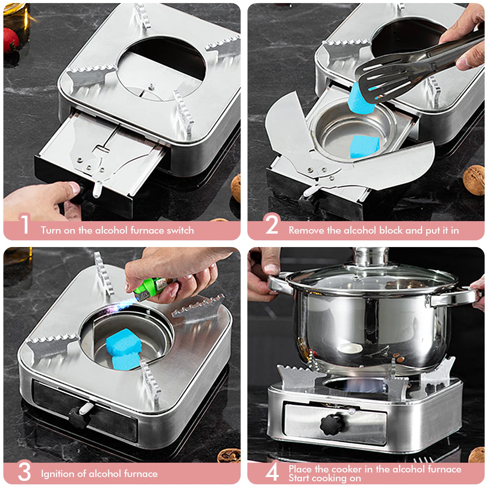 *Conception sûre: conception d'isolation thermique entièrement enveloppante, le réservoir de carburant n'est pas en contact direct avec le corps du four. Le plateau de pied en forme d'escalier et le four à alcool dans son ensemble sont en aluminium épaissi, ce qui permet de placer en douceur une casserole / poêle ronde. *Conception pull - out: conception pull - out, bouton rotatif noir peut verrouiller le tiroir, peut être retiré pour placer le carburant, pas besoin de déplacer le four à alcool, plus pratique et plus sûr. Réchaud à Pot-au-feu De Style Soucoupe En Acier Inoxydable Avec Noyau D' alcool, Adaptation *Poêle à alcool portable: peut être chauffé avec de l'alcool, pas besoin de brancher, facile et rapide, peut être utilisé à l'extérieur, peut être utilisé à la maison pour la fondue, les sautés. Mini Brûleur à Alcool En Acier Inoxydable Avec Puissance De Feu Réglable, Coupe-vent, Style Tiroir Pour Barbecue, Hotpot, Cuisine En Plein Air (or Rose Rechaud Gaz Camping Réchaud à Alcool En Cuivre Ultra-léger Portable Camping Mini Cuiseur à Alcool Brûleur à Alcool Poêle à Carburant Pour Cuisson En Plein Air Pique-nique Barbecue[vert] Alpinisme Et Camping Allume Dimensions compactes : 18x18x9 cm, ça se glisse facilement dans ton sac à dos. Idéal pour le camping, les randonnées, les pique-niques ou les soirées plage