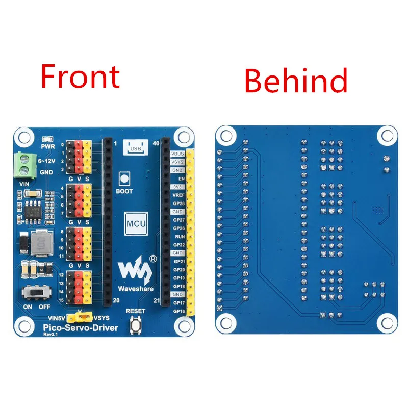 Integrates 5V regulator, up to 3A output current, allows batt power supply from the VIN terminal Exposes unused pins of Pico, easy expansion Comes with development resources and manual (Raspberry Pi Pico C/C++ and MicroPython examples) Specifications OPERATING VOLTAGE 5V (Pico) or 6~12V (VIN terminal) SERVO VOLTAGE LEVEL 5V LOGIC LEVEL 3., 3V CONTROL INTERFACE GPIO MOUNTING HOLE SIZE 3., 0mm DIMENSIONS 65 × 56mm Standard servo interface, supports common used servo. Module de Servodriver Waveshare pour Raspberry Pi Pico, 16 Exposes unused pins of Pico, easy expansion Le module de pilote de servomoteur Waveshare pour Raspberry Pi Pico, sorties 16 canaux, résolution 16 bits est idéal pour contrôler un bras robotique ou un marcheur hexapode Module Driver Servo Raspberry Pi Pico Waveshare Servo Driver Module For Raspberry Pi Pico Ideal For Carte Extension Servo Pour Projets Le m odule de servodriver Waveshare pour Raspberry Pi Pico, 16 canaux, résolution 16 bits intègre un régulatr 5 V, jusqu'à 3 A de courant de sortie, permet l'alimentation de la batterie à partir du terminal VIN