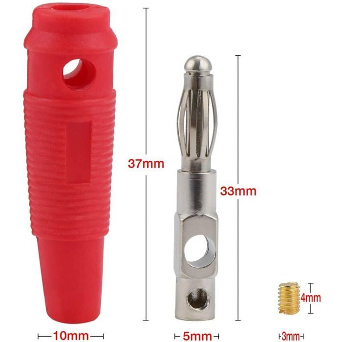 Connecteurs Haut-parleur Rouge Noir Fiches Bananes Males Fiches Banane Haut-parleur 4pcs BA1403R - Rhodium, Verrouillables, 7mm, Pour Ampli, Home Cinéma (Rouge/Noir) Connecteur Empilable Connecteur Banane Rouge Noir Ces fiches bananes de 4mm sont indispensables pour vos connexions électriques ! En cuivre pur nickelé, elles supportent jusqu'à 32A et 1000V Fiche banane standard de 4 mm. - Les conducteurs en cuivre ont de meilleurs résultats de conductivité et de stabilité. - Le revêtement nickelé résiste à la... Contenu de la livraison : 10 fiches bananes, 5 noires et 5 rouges NUOBESTY Lot de 10 fiches bananes à 4 feuilles sans soudure