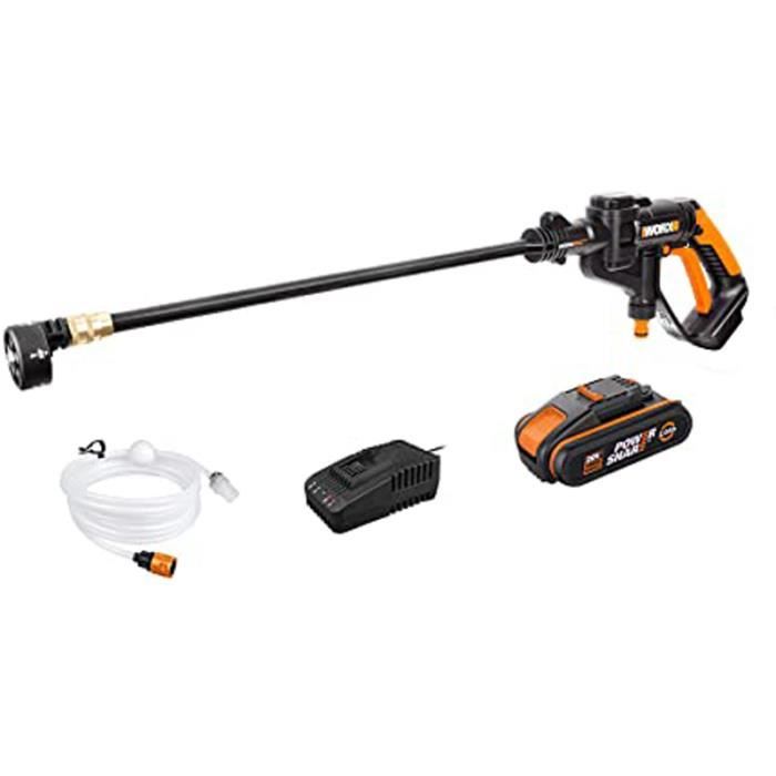 Tant qu'il y a de l'eau, il peut fonctionner bien. 2 x 2,0 Ah, 20 V, 1 heure. Chargeur rapide, buse multi-pulvérisation 5 en 1, tuyau de 6 m. · Poids : 20 V / 2,0 Ah Li-Ion. · Débit d'eau : 120 l/h. · Maximum 5 en 1 Différentes formes de pulvérisation offrent de nombreuses possibilités d'utilisation : Choisissez parmi cinq angles de pulvérisation (0°, 15°, 25°, 40° et douche) pour démarrer votre projet de nettoyage. 4, 2pc batteries (WA3551), 1pc chargeur (WA3880), 1pc 6m tuyau d'eau, 1pc lance, 1pc bouteille de savon, 1pc brosse, 1pc seau d'eau pliable MULTI-APPLICATION - Nettoyeur haute pression sans fil pourrait répondre aux votres différentes besoins quotidiens en enlevant les taches sur les voitures, les vélos, les murs, le verre et la terrasse. MULTI-MODE - 5 modes parmi lesquls il y a le mode de pulvérisateur, vous offrent une polyvalence pour différents travaux. Le filtre à l'entrée assure le fonctionnement sans craindre d'être obstrué. WORX - Nettoyeur à pression et pulvérisateur portable sans fil Hydroshot 20V-2Ah - WG620E (Livré avec batterie et chargeur, set d'accessoires) 119,28 € Meilleur prix total 119,28 € livraison incl Connexion rapide Le nettoyeur haute pression avec raccord rapide pour le robinet est livré avec des accessoires pratiques et est immédiatement utilisable comme arme polyvalente contre la saleté et pour un arrosage confortable. WORX Power Share Hydroshot WG644 Nettoyeur électrique portable 40 V 2 x 20 V (piles et chargeur inclus) – Noir/orange Nettoyeur Portable Pour Camping Et Jardin Nettoyeur Haute Pression Sans Fil, Pistolet De Nettoyage Haute Pression Nettoyage Voiture Jardin Batterie Pas besoin de déplacer des machines lourdes, et économiser de l'énergie. Transportable Worx Hydroshot est alimenté par une batterie et tire l'eau de n'importe quelle source qu'elle prépare Portable Par conséquent, l’Hydroshot convient également à tous les domaines sans raccordement fixe à l’électricité et à l’eau. Puissant 10 fois plus de pression du tuyau d’arrosage et de la buse pour obtenir l’effet de nettoyage souhaité. Idéal pour les déplacements Que ce soit sur la plage, en camping, en vacances, en bateau, ., ., ., Bien entendu, vous pouvez également connecter l’Hydroshot à un robinet d’eau ordinaire.