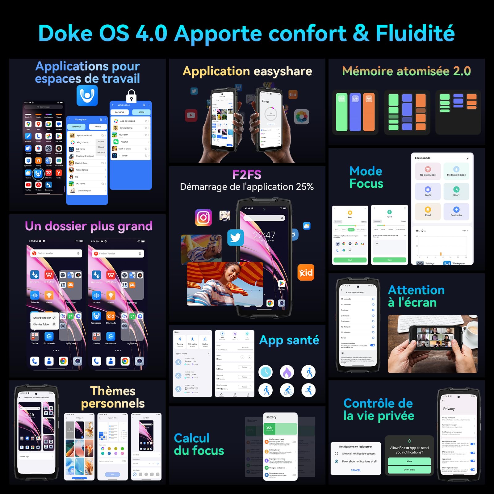 Caméra arrière 8 MP (ultra grand angle 120° et ultra macro jusqu'à 1 cm) Le BV9200 produit des photos plus larges pour plus de contenu dans votre cadre sans avoir à reculer, grâce à la caméra arrière ultra grand angle 120° 8 MP. C'est également un excellent compagnon pour les amateurs de plein air tels que les grimpeurs, les alpinistes, les surfeurs, les kayakistes, les triathlètes, les plongeurs, les pêcheurs, les randonneurs, les skieurs, les amateurs de sports nautiques et autres activités de plein air., Système : Android 15 Large éventail d'utilisations pour les personnes travaillant dans différents secteurs : commerçants, agents des forces de l'ordre, livreurs, jardiniers, artisans, agriculteurs, etc. Il prend également en charge la 4G dans les deux emplacements simultanément - profitez d'une connexion plus rapide. Soutenu par le puissant GPU Arm Mali-G57 et la mémoire rapide UFS 2., 1 de 256 Go, le Mediatek Helio G99 accélère encore le traitement des données et maximise les performances dans les tâches quotidiennes. Téléphone Incassable Blackview Blackview BV9300 Smartphone Incassable(Lampe De Poche 100LM), Batterie 15080mAh, Helio G99 21GB+256GB, 6.7'' 120Hz 2.3K Ecran, Caméra 50MP+32MP, Téléphone Débloqué Etanche IP68 Android 12, NFC Noir Téléphone Débloqué 4G Android 15 Blackview BV9300 Pro - Avis Sur Ce Téléphone Incassable Avec jusqu'à 24 Go de RAM, vous bénéficiez d'un accès plus rapide aux données, d'un multitâche plus efficace et de moins de ralentissements lors de l'exécution de tâches exigeantes. 📶【4G Double SIM téléphones Android et 24 mois de garantie】. Écran secondaire rond Confort en un coup d'œil L'écran secondaire du BV9300 Pro vous permet d'utiliser facilement les fonctions importantes et d'économiser de l'énergie. Angle de vision (H/V) : angle complet Dimensions du produit : 184,6*85,6*22,8 mm, poids du produit : 524 g !En raison de sa grande batterie de 15080 mAh, il est plus lourd qu'un téléphone portable moyen. La technologie NFC permet également à votre téléphone d'échanger des données directement entre différents appareils, sans passer par un ordinateur. Informations en temps réel Restez informé des dernières actualités, même dans des conditions défavorables. Caméra arrière 64 MP + caméra avant 32 MP Caméra arrière 64 MP La caméra arrière ISOCELL JN1 64 mégapixels du BV9300pro fait un grand pas en avant avec une fidélité des couleurs améliorée de 30 % et affiche les couleurs réelles de tous les sujets photographiés avec une précision maximale. Et le smartphone BV9300 PRO outdoor avec la technologie d'expansion de la RAM, vous pouvez obtenir 12 Go de RAM virtuelle supplémentaire via les paramètres, jusqu'à 24 Go de stockage. Processeur : MT6789V/CD(G99) 6 nm, Cortex-A76 2,2 GHz*2, Cortex-A55 2,0 GHz*6, 1,8 G ; GPU : Arm Mali-G57 CM2 🔦【100 Lumens Superbrillant Lantern】 La BV9300Pro facilite votre vie quotidienne en offrant une torche de 100 lumens (LM) avec une portée allant jusqu'à 10 m. Grâce à son design ergonomique et à la technologie Dynamic Pressure Sensing, vous pouvez déverrouiller votre téléphone instantanément. Batterie : 15080 mAh, type C, prend en charge une puissance de charge allant jusqu'à 33 W, chargeur non inclus Mobile : 3G/4G·Nano-SIM·Nano-SIM·microSD ; 2,4G/5G, 802., 11 a/b/g/n/ac Que vous campiez la nuit dans une forêt isolée ou que vous soyez coincé dans un ascenseur en cas de panne de courant, la source lumineuse fiable et ultra-lumineuse de la BV9300 Pro est indispensable. Type de panneau (IPS, autre) : FHD+ IPS, PPI/DPI : PPI : 391, Luminosité, cd/m² : 500 Accédez à la commodité et économisez de l'énergie avec l'écran secondaire BV9300 Pro, qui facilite l'utilisation des fonctions clés et offre une expérience utilisateur plus intelligente et rationalisée. L'appareil photo ultra grand angle de 8 MP 120° offre un champ de vision beaucoup plus large dans vos photos avec moins d'effort et l'appareil photo frontal de 32 MP avec mode beauté. Contenu de l'emballage : téléphone portable*1, emballage*1, mode d'emploi*1, câble USB*1 Capteurs : capteurs (capteur de proximité, capteur de lumière, capteur G, etc. Quel que soit votre lieu de résidence ou votre destination, vous pouvez vous connecter aux réseaux mobiles locaux partout dans le monde avec votre BV9300 Pro. Prise en charge de la recharge inversée OTG 5 W Lorsque vos smartphones de secours ou vos écouteurs sans fil affichent un avertissement de batterie faible, mais qu'aucune prise de courant n'est disponible, la recharge inversée du BV9300 est pratique pour fournir un peu d'énergie, comme une mini-centrale électrique portable avec une batterie de 15 080 mAh. N'ayez plus peur de vous perdre dans la nature. Appareil photo : appareil photo principal 64 Mpx + appareil photo frontal 32 Mpx Qu'il s'agisse de camper dans une forêt isolée la nuit ou de prendre un ascenseur avec une coupure de courant, une source de lumière fiable et superbrillante de la BV9300 est essentielle. Lecteur d'empreintes digitales sur le côté Oubliez les mots de passe ou les schémas fastidieux et entrez dans l'ère de la reconnaissance faciale et du déverrouillage par empreinte digitale ! Méthode de déverrouillage : reconnaissance faciale + empreinte digitale Description du produit Pourquoi choisir le Blackview BV9300 Pro ? Le smartphone robuste Blackview BV9300Pro prend en charge 32 bandes de fréquences mondiales. Android 15 0S tout nouveau Vous disposez d'une meilleure initiative en matière de droits de notification et d'accès aux médias. Boîte à outils numérique Les outils utiles du 9300 pro sont polyvalents et offrent une aide précieuse pour la construction, la randonnée et d'autres activités de plein air. 🚀【24 Go de RAM + 256 Go de ROM + Helio G99 Octa Core + Android 15 Telephone】 Phones Révolutionnez votre expérience de la vitesse et de la perform