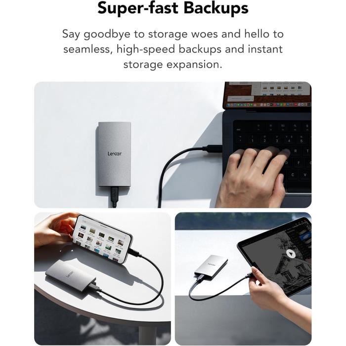 1 Transfert Haut Débit 2 En Déplacement 3 Dissipation Thermique Lexar ES3 SSD Externe 2To, USB3.2 Gen2 Portable SSD, PSSD jusqu'à 1 050Mo/s en Lecture, 1 000Mo/s en écriture, Disque SSD Externe Compatible avec iPhone série 15/Mac/PS5/XBOX (LES3XXX002T-RNSNG (1) Les vitesses sont basées sur des tests internes. La capacité de stockage réelle utile peut varier. Remarque : la fonction Magsafe n'est pas disponible dans cette version Lexar ES3 SSD externe 2 To, USB 3.2 Gen2 SSD portable, PSSD jusqu'à 1050 Mo/ s en lecture, 1 000 Mo/s en écriture, disque SSD externe compatible avec iPhone Série 15/Mac/PS5/XBOX/ordinateur portable/PC (2) Le lecteur SSD portable Lexar ES3 est classé résistant aux chutes de 2 mètres selon des tests internes effectués dans des conditions contrôlées. Transfert de données à grande vitesse : le SSD externe Lexar ES3 prend en charge l'USB 3., 2 Gen 2 jusqu'à 1 050 Mo/s en lecture et 1 000 Mo/s en écriture pour transférer rapidement des fichiers pour un travail plus efficace. Large compatibilité : compatibilité du SSD portable Lexar ES3 avec la série iPhone 15 (non pris en charge sur l'iPhone 14 et les modèles plus anciens), les appareils mobiles Android, les ordinateurs portables, les appareils photo, la Xbox X|S, la PS4, la PS5, la console de jeu, etc. Les capacités réelles de résistance à l'eau, à la poussière et aux chutes peuvent varier. Test du SSD externe Samsung T7 Shield : rapidité et performance au rendez-vous Lexar ne peut être tenue responsable de toute perte de données ou d'images. Principaux points forts · Capacité du stockage numérique. 2 To · Interface du disque dur. USB 3.0 · Technologie de connectivité. USB · Marque. Lexar
