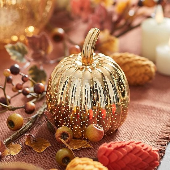 Idéales pour Halloween, Thanksgiving ou Noël, elles créent une ambiance chaleureuse dans le salon, le jardin ou sur la table. Décorations de lanternes citrouilles d'automne : Ces lanternes citrouilles se posent parfaitement sur toute surface horizontale et peuvent être placées sur une table, une étagère, une table de chevet ou un réfrigérateur Avec leur lumière LED douce et leur design compact et élégant, elles sont parfaites pour toute décoration festive. 7 cm x 7 cm x 7 cm / 2,76 x 2,76 x 2,76 Matériau : PVC Éclairage : LED Couleurs : Jaune et or Poids : env. 【Compacte et portable】 : Avec un diamètre d’environ 7 cm (2,76 pouces), chaque citrouille se place et se transporte facilement – parfaite pour les petits espaces, les étagères ou à emporter comme touche lumineuse. Citrouille Halloween Extérieur Vuggdt Citrouilles Lumineuses à DEL Pour Halloween, Décorations D'automne Pour Thanksgiving, Halloween, Maison, Cuisine, Table Lanterne Citrouille Pvc Contenu de l’emballage 3x Lanternes citrouilles avec LED (1x citrouille jaune, 2x citrouilles dorées) Garantie qualité Fabriquées en PVC durable, ces lanternes sont solides et sûres pour une utilisation intérieure et extérieure. 0,3 kg / 0,66 lb Remarque chaleureuse Ces lanternes citrouilles font un excellent cadeau pour la famille et les amis, surtout pendant les fêtes d’automne et d’hiver. 【Éclairage LED pour une ambiance chaleureuse】 : Chaque citrouille décorative est équipée d’une LED intégrée qui diffuse une lumière douce et chaude – parfaite pour une ambiance cosy, en intérieur comme en extérieur. L’éclairage LED évite toute surchauffe – idéal pour une utilisation quotidienne et saisonnière. Lot de 2 Citrouilles Lumineuses en Rotin Spécifications du produit Taille : env. Set de décorations Citrouilles, Méri Méri - Merci Léonie