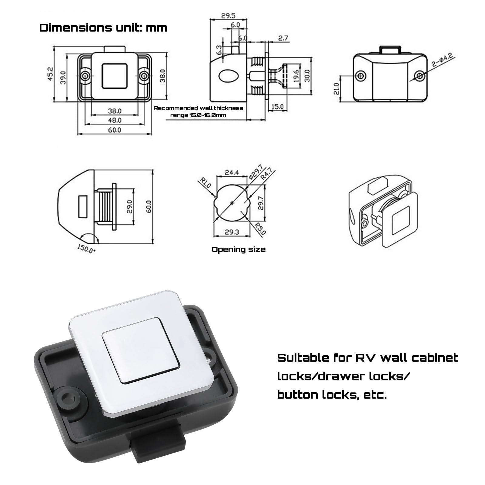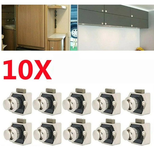 EMSea 1 loquet à bouton poussoir pour placard de camping-car Piece Pour Frigo Dometic Camping Car 2 Pièces Serrures De Tiroir De Vr Verrouiller Le Bouton Poussoir Porte Serrure Camionnette Antivol Placez la base à l'intérieur du tiroir, placez le bouton et la base du bouton à l'extérieur et connectez la base et le bouton., Étapes d'installation : 1., Confirmez la position d'installation et installez la boucle de porte sur la planche au-dessus du tiroir avec trois vis., 2., L'ouverture du panneau de porte du tiroir est de 29 à 31 mm. Cette conception d'ensemble convient à différents types de serrures telles que les serrures d'armoires murales de camping-car, les serrures de tiroirs, les serrures à boutons, etc. Le loquet de porte est chargé de fournir une fixation supplémentaire lorsque la serrure est fermée, augmentant ainsi la sécurité. Dans ce rayon, vous trouverez un choix de serrure, loqueteau, poignée et fermeture pour les camping-cars et fourgons aménagés. Nous proposons des poignées de portes intérieures comme pour la salle de bain ou les WC, mais également pour les placards ou meubles intérieurs Les vis sont les principaux accessoires utilisés pour fixer ces composants. 2 Pieces Verrouillage de La Poignée À Bouton, Loquet À Bouton-Poussoir... En utilisant cette base de verrouillage, vous pouvez facilement installer et remplacer divers verrous pour empêcher les objets de tomber lorsque l'armoire est ouverte pendant que le véhicule est en mouvement., Étapes d'installation : 1., Confirmez la position d'installation et installez la boucle de porte sur la planche au-dessus du tiroir avec trois vis., 2., L'ouverture du panneau de porte du tiroir est de 29 à 31 mm. La base du loquet est la pièce maîtresse de l’ensemble.