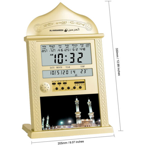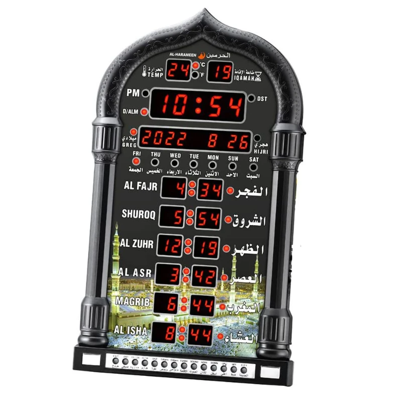 Septpenta Azan Horloge, Horloge de Prière LED, Horloge Murale, Horloge de Prière Musulmane, avec Musique de Prière de la Mecque, Horloge Musulmane Numérique, Horloge Murale Islamique Fonction heure d'été (DST) 12/24 heures. Horloge murale musulmane bien établie, horloge Azan, horloge de prière numérique pour table, alarme islamique pour mosquée - Chine Horloge Azan horloge musulmane et horloge numérique de la Mosquée prix Fonction de rappel : fonction d'alarme (une alarme / alarme de cycle) et peut donner une invite d'alarme tic-tac. Fonction de rappel de l'heure AZAN avec musique de prière, parfaite pour la maison ou le bureau. C'est également un excellent cadeau pour votre famille et vos amis. L'affichage de la température en temps réel (°C) aide à maintenir des conditions idéales dans l'espace de culte. [Personnalisation de l'alarme intelligente]Mode de dévotion quotidienne pour des routines cohérentes ou réglage du silence du week-end (vendredi/samedi SJLERST Horloge Murale Automatique Islamique, Alarme, Prière Musulmane, Cadeau Du Ramadan Decoration De La Maison 84277697 Il y a 1500 villes au choix. Deux types d'affichage de la température : fonction de température, Celsius, peuvent être commutés. Fonction snooze, fonction snooze pendant 5 minutes.