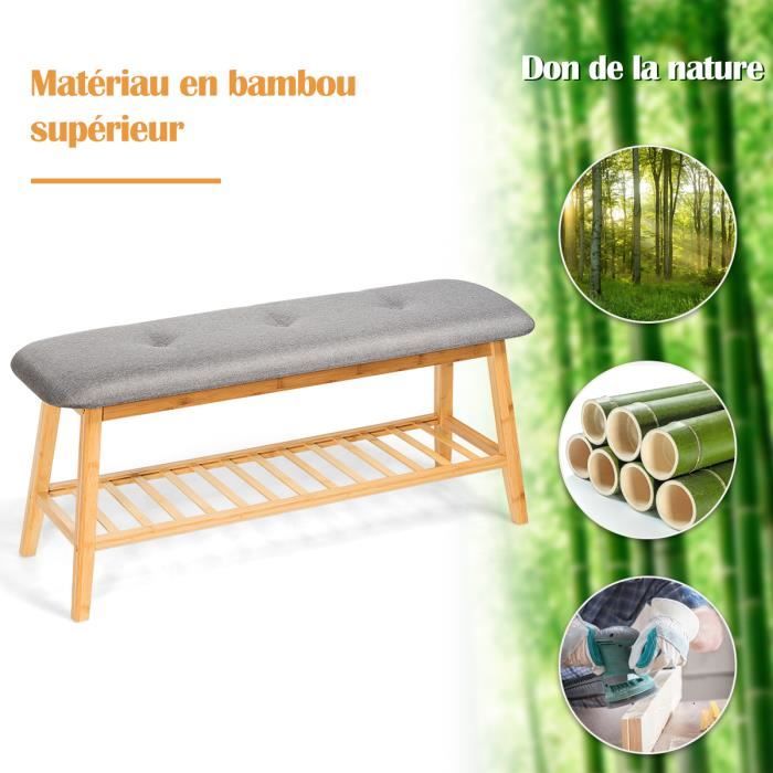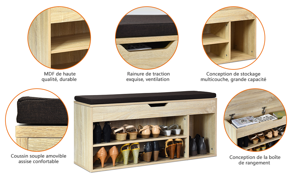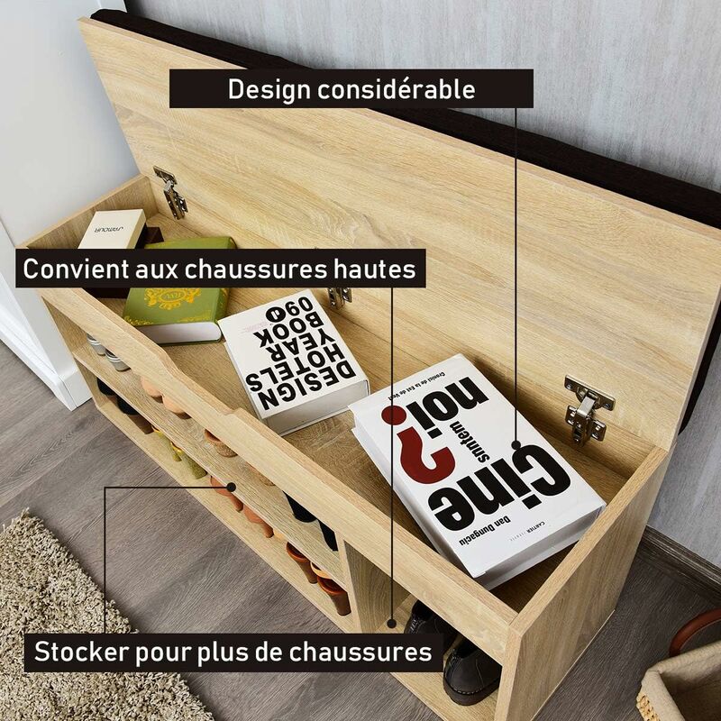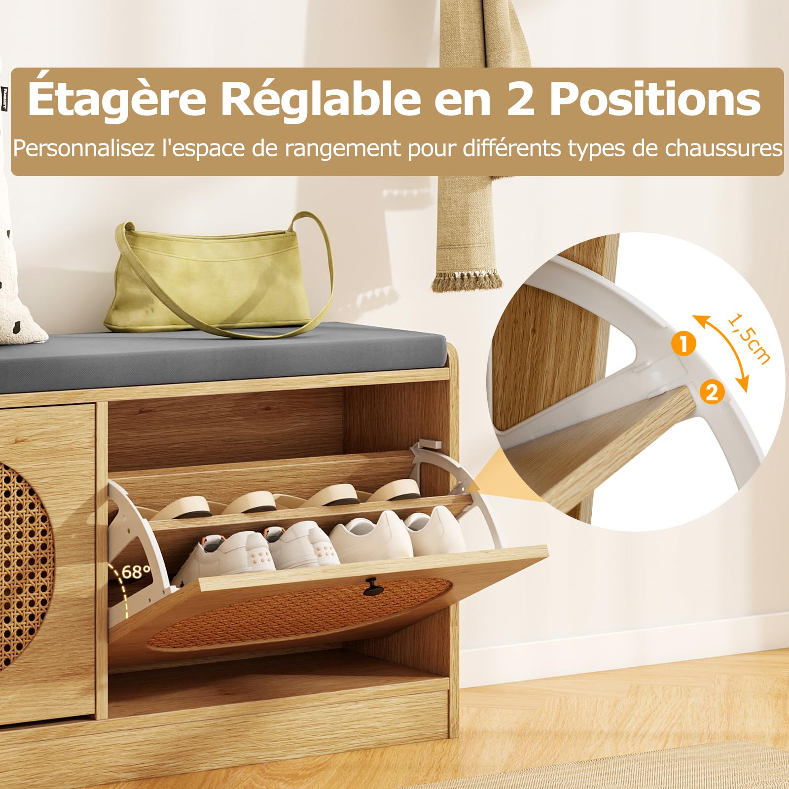 Que vous souhaitiez ranger des bottes, des baskets ou des sandales, les étagères réglables facilitent le rangement de divers types de chaussures. Simple et pratique]Le banc à chaussures est simple et convient à de nombreux styles de maison. Il a un grand espace de stockage avec 3 compartiments de 2 différentes tailles, c’est pratique pour les chaussures et les bottes Rembourré d'un coussin en éponge, ce banc d'entrée offre un endroit confortable pour vous asseoir lorsque vous enfilez ou enlevez vos chaussures. 【Confort et Praticité】Ce banc à chaussures dispose d'un coussin rembourré en éponge douce, offrant un siège confortable pendant que vous mettez ou enlevez vos chaussures. Le rangement compact pour chaussures, mesurant 101,5 x 24 x 48 cm (L x l x H), est un choix idéal pour optimiser l'espace. Banc Entree Banc Chaussures Entrée Avec Coussin, Banc De Rangement En Rotin Pe 2 Portes A Rabattement Etageres Reglables A 2 Positions Pour Entree Salon 97515020 Siège Rangement 120kg Capacité Les portes en rotin favorisent la circulation de l'air pour garder vos chaussures fraîches et bien ventilées. La housse de coussin avec une fermeture éclair lisse peut être facilement retirée et lavée. 【Placement Polyvalent】Que ce soit dans votre couloir, salon ou chambre, ce meuble à chaussures s'intègre parfaitement dans toutes les pièces. 【2 Portes Abattantes】Le meuble chaussure entree comporte des portes à abattement pratique, permettant un accès facile à vos chaussures et aidant à maintenir un espace organisé et propre. Costway Banc à Chaussures, Banc De Rangement Avec 10 Compartiments Et Siege Meuble A Chaussures Avec Eponge Rembourre Et Coussin Enleve Separateurs Reglables Charge Maximale 100kg Blanc 【Rangement Personnalisé】Adaptez vos besoins de rangement avec des étagères réglables derrière 2 portes. Dimensions du produit. 24P x 101,5l x 48H centimètres ; Matériau du cadre. Rotin ; Couleur. Naturel ; Taille. 101,5 x 24 x 48 cm ; Finition du meuble. Rotin