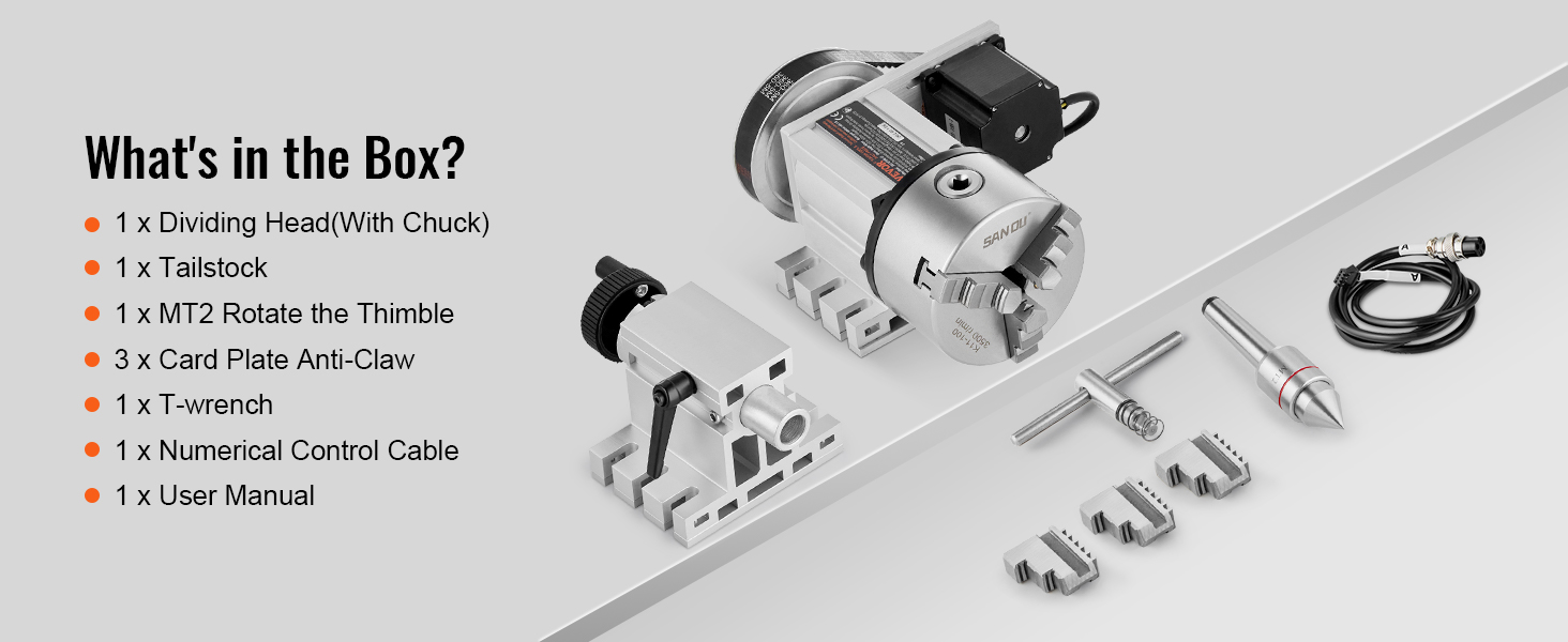 VEVOR Diviseur indexé K11-100mm contre-pointe pour fraisage mandrin à 3 VEVOR Dividing Head, K11-100mm 3-Jaw Chuck, CNC Router Milling Machine Rotational Axis 4th Axis A Axis Indexing Head, 66 mm(2.6)/65 mm Center Height MT2 Tailstock 6:1 Gear Ratio, Universal for Engraving Livré complet avec 3 mâchoires internes et 3 mâchoires externes, pouvant accueillir un diamètre de serrage maximum de 0,08 à 1,18'' (2 à 30 mm) pour les mâchoires internes et de 1,18 à 3,15'' (30 à 80 mm) pour les mâchoires externes. SpécificationsNuméro du modèle de l'article : BS4-KP100-57Hauteur centrale : 2,6/65 mmTension : 3,75 V CC, 2,5 A. La précision à son meilleur : avec un rapport de démultiplication de 6:1, notre diviseur indexé réduit la vitesse de rotation du moteur, offrant ainsi une plus large gamme d'angles d'indexation pour vos tâches d'usinage. La précision à son meilleur : avec un rapport de démultiplication de 6:1, notre diviseur indexé réduit la vitesse de rotation du moteur, offrant ainsi une plus large gamme d'angles d'indexation pour vos tâches d'usinage De plus, la réduction de la vitesse assure un fonctionnement plus fluide du moteur. Mandrin De Tour K11-130 130mm 3 Mâchoires Plain Back Design Milling... Excellence du moteur pas à pas : équipé du moteur pas à pas biphasé Nema23, il mesure un format compact de 57 x 57 x 56 mm (2,2 x 2,2 x 2,2 pouces) et dispose de quatre fils. Type de mandrin : mandrin à 3 mors K11-100 mm.