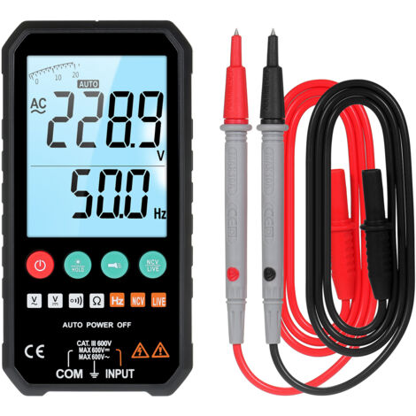Caractéristiques : Nom de pièce : multimètre intelligent., Matériau : ABS., Couleur : voir photo. Éclairage de la lampe de poche LED : la lampe de poche LED permet une inspection étroite des points de contact, ce qui la rend pratique pour les mesures de sonde. 1 mode d'emploi en anglais. Dimensions : 136,2 x 44,5 x 32 mm (longueur de la ligne 60 mm). Résistance : 2 000 Ω/20 kΩ/200 kΩ/2 000 Ω/20 Ω, ± (1,0 % + 3)., Nombre : 2000., Affichage : HTN. Comment utiliser la fonction ncv du multimètre - Connaissances - Shenzhen GVDA Technology Co., Ltd Multimètre Intelligent Multifonction HT93 Avec Détection NCV Et 287020187899 Indice de sécurité : EN61010-2-030 EN61010-2-033 CAT III 600 V. Arrêt automatique : pour économiser l'énergie de la batterie, le multimètre s'éteint automatiquement après 15 minutes d'inactivité, prolongeant la durée de vie de la batterie et améliorant l'efficacité. Fonctions multiples : le multimètre numérique multifonction HT93 est conçu avec diverses fonctionnalités, y compris la détection NCV, la plage automatique, l'indication de batterie faible, l'éclairage de la lampe de poche LED et l'arrêt automatique. Indicateur de batterie faible : √ Mise hors tension automatique : √ Rétroéclairage : √ Lampe de travail : √ Alimentation : 2 piles AAA de 1,5 V (non fournies)., Poids : environ 66,9 g. Testeur électrique Lampe LED Multimètre Intelligent Multifonction HT93 Avec Détection NCV Et Lampe Testeur Automatique Lampe LED Multimètre intelligent multifonction HT93 avec détection NCV et lampe de poche Gamme automatique/manuelle : automatique. Lorsque l'instrument détecte un signal de champ électrique fort, le rétroéclairage rouge s'allume, et il émet un bip sonore rapide, tandis que l'écran affiche « --H » Portée automatique : lorsque l'instrument est réglé en mode automatique, il identifie automatiquement les signaux de mesure de tension, de résistance et de continuité. Test en direct : √ NVC : √ Test de phase : √ Continuité : √ Stockage des données : √ True RMS : √ Bande passante : 40 ~ 1 kHz. Caractéristiques : Détection NCV : en mode NCV, rapprochez progressivement la sonde de détection NCV de l'instrument de la zone testée. Tension CC : 2 000 V/20 V/200 V/600 V, ± (0,5 % + 3). 【Détection NCV】Le mode NCV permet une détection sûre des signaux de champ électrique faibles et forts.