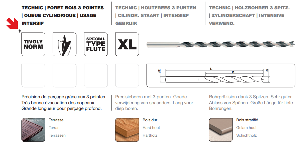 Foret 3 Pointes Queue Hexa 3 Mm TIVOLY Perçage Bois Forêt TIVOLY Foret Bois 3 Pointes Queue Hexagonale 4 Mm - 10803720400 Mèche à Bois TIVOLY Foret pour bois hexagonal 3 mm TIVOLY – Perçage précis | TIVOLY Foret performant et précis dans tous les types de bois grâce à son affûtage 3 pointes et ses goujures grand dégagement. Diamètre : 3 mm Longueur utile : 30 mm. Comparez les modes de livraison et choisissez celui qui vous correspond le mieux Foret bois 3 pointes queue hexagonale Ø3 mm TIVOLY - 10803720300 Foret pour bois ø 24 x 450 mm - Perçage précis | TIVOLY