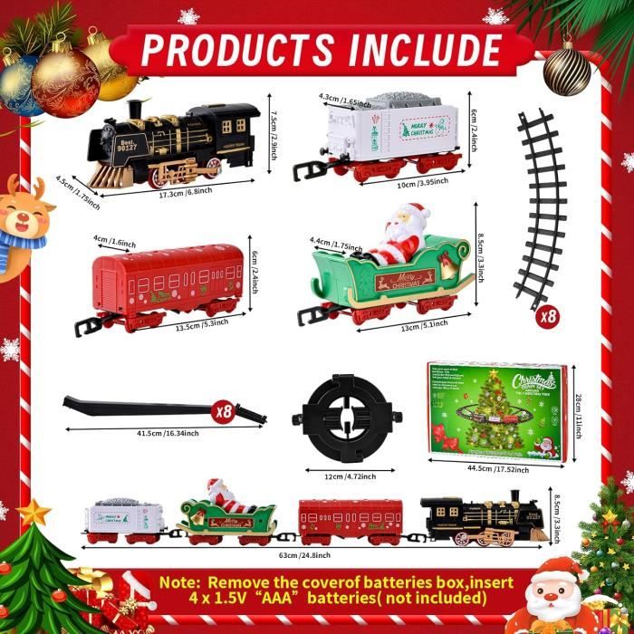 Les supports robustes assurent une stabilité accrue. Les enfants peuvent assembler les pièces de la voie fermement et facilement pour créer leur circuit ferroviaire préféré, puis placer le train pour garçon accroché avec précision sur les rails, et enfin actionner l'aiguillage pour que le train avance régulièrement sur les rails. Train électrique rechargeable pour arbre de Noël-Train télécommandé pour garçons et filles avec vapeur, lumières et son. 8,26 €. Commande minimale: 120 pièces Ce circuit de train deAO va faire craquer tes enfants ! Avec ses 13 pièces, ils peuvent construire une piste de 11 pieds (environ 3.3m) avec des rails droits et courbes Décoration festive et cadeau idéal : Transformez votre sapin de Noël en un paradis hivernal magique ! deAO Circuit Classique Ferroviaire pour Enfants Train avec Luière Ce train du Père Noël apporte la joie des fêtes avec ses charmantes décorations et son mouvement régulier. Présenté dans une boîte cadeau festive, ce train de Noël est un cadeau idéal pour les enfants et les familles. Train Electrique Jouef Jouet Noël Lumineux Circuit Train Noël DeAO - Set Complet Avec Phare Et Sons Réalistes Pour Enfants Train Classique Enfant 3 Ans Train Père Noël Avec Fumée Système de rails robuste et facile à assembler : Dotés d'un système de verrouillage à encliquetage amélioré et d'une construction résistante aux chocs, les rails s'assemblent solidement et ne se desserrent ni ne s'effondrent, garantissant un fonctionnement fluide. Coffret de train de Noël créatif : Ce coffret de train électrique comprend quatre wagons différents : une locomotive, un wagon à charbon, un wagon avec le Père Noël et un wagon de marchandises, ainsi que des rails et des accessoires festifs pour le sapin. Effets sonores, lumineux et de fumée réalistes : Ce train électrique autour du sapin de Noël offre des sons réalistes, des phares lumineux et des effets de fumée pour une expérience immersive des fêtes.