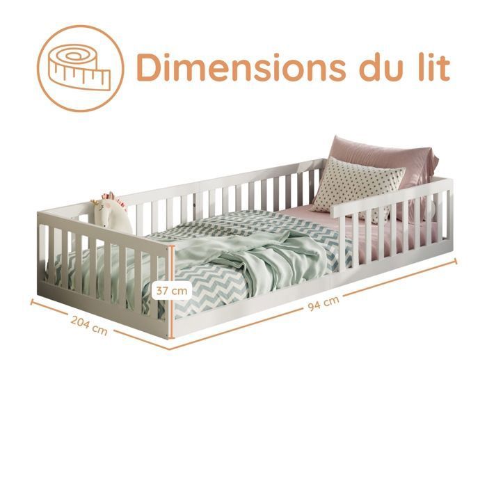 Lit de sol Meulbaty avec lattes en pin massif - Notre sommier est composé de 8 lattes épaisses en pin massif, offrant une stabilité et une durabilité maximales pour un usage quotidien. EN STOCK : Lit enfant gustavo lit au sol 90x200 cm d'inspiration montessori, avec barrières de protection, en pin massif lasuré blanc pas cher - Retrait & Livraison - Paiement 4X disponible. Chambre enfant à prix discount Dimensions du matelas recommandées : 90 x 200 cm. Accès sûr et facile – Des barrières sur toute la longueur, une barrière de sécurité centrale, deux entrées faciles sur un côté long et des bords arrondis sur tous les montants assurent une sécurité supplémentaire. Tous les bords ont été soigneusement poncés et polis pour éviter les rayures et les blessures, garantissant ainsi un environnement sûr et confortable. Lit Bébé Bas Avec Barrières Sécurité Lit Au Sol 90x200 Cm, Lit Au Sol Bébé, Lit Enfant ... - Leroy Merlin Lit Au Sol Enfant 90x190 Sommier de lit robuste en bois pour tout-petits - Le cadre et les lattes sont fabriqués en pin massif à 100 %, ce qui les rend particulièrement durables. Ce lit favorise l'autonomie de votre enfant et une transition en toute sécurité vers son propre lit. Les barrières sont recouvertes d'une peinture PU non toxique et sans danger pour les enfants. Contrairement aux autres lits en MDF ou en contreplaqué, notre structure en bois massif offre une stabilité et une durabilité exceptionnelles, un choix sûr pour votre enfant. KecDuey Lettino 90 x 200 cm, letto a castello in legno di pino, letto con scala, cabinet e rete Sa conception ouverte crée un environnement accueillant qui encourage bébé à explorer tout en lui offrant un endroit confortable et douillet pour dormir. Lit Montessori : c'est quoi ? Quels bienfaits