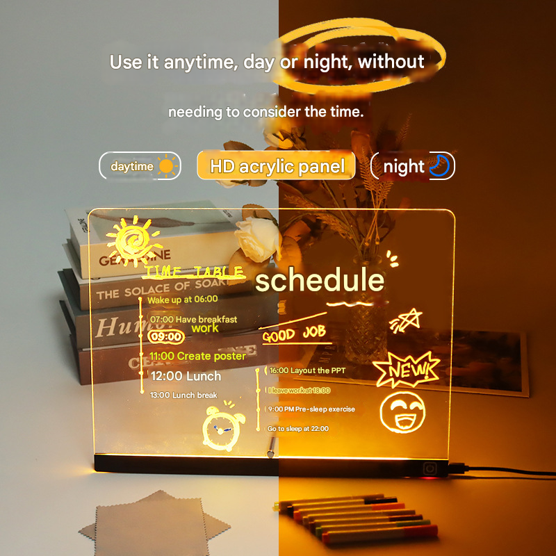 Lisse, résistant aux rayures et aux couleurs intenses : la surface en acrylique de haute qualité offre une sensation d'écriture fluide et reste résistante aux rayures et durable. Il comprend un tableau acrylique transparent de 30 x 20 cm, un support, deux lingettes et sept feutres colorés, parfaits pour dessiner et écrire des messages de manière imaginative En tant que tableau mémo transparent avec veilleuse, il assure également un éclairage d'ambiance lors de l'apprentissage et du jeu., 2., Que ce soit comme point fort décoratif dans le salon ou comme surface d'exercice pour les petits artistes : la planche à dessin lumineuse Inspiré par l'imagination illimitée. notre tableau à dessin LED est adapté pour les petits artistes, tandis que le tableau lumineux offre aux enfants un plaisir instantané et une liberté créative Ainsi, notre tableau d'affichage transparent avec veilleuse devient une expérience interactive, et le tableau d'écriture lumineux transparent favorise l'imagination, la joie de lire et la créativité chez les enfants Apprentissage ludique avec des histoires : les 6 feuilles de modèle sont conçues à double face : à l'avant pour le dessin, à l'arrière avec de petites histoires. Rechargeable et toujours prêt à l'emploi : oubliez le changement constant de piles ! Tableau mémo lumineux à LED en acrylique pour enfants - Pour Quatre mondes lumineux fascinants : plongez vos messages dans des couleurs vives : arc-en-ciel, bleu ciel, coucher de soleil ou lumière chaude. Remarque : Les mesures étant prises à la main, les tailles indiquées peuvent varier légèrement. Cette planche à dessin LED offre des heures de plaisir sans fil pour peindre, écrire et dessiner, que ce soit au bureau, dans la chambre de votre enfant ou en déplacement Avec 12 feutres colorés inclus, vous pouvez ajouter une touche de créativité à vos notes ou créer de superbes œuvres d'art colorées, ce qui en fait un outil ludique pour les enfants et un atout pratique pour les adultes Tableau Mémo Couleur Enfant Tableau à Dessin Pour Enfants - Marque - Modèle - Écran LCD 10 Pouces Planche A Dessiner Lumineuse Notre planche à dessin lumineuse dispose d'une batterie intégrée qui se recharge facilement via un câble USB-C.