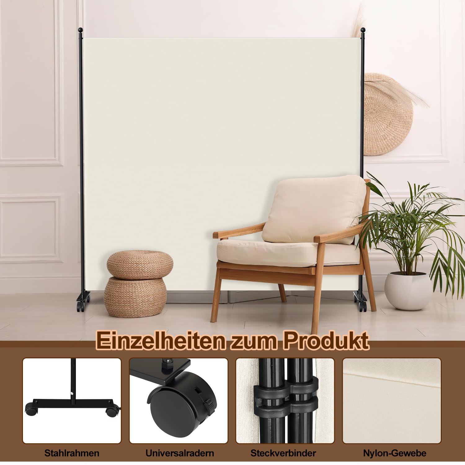 Paravent de jardin à roulettes, beige, 263 x 181 cm - Leroy Merlin Paravent 3 Panneaux 263x181cm Séparation Pièce Fiqops Paravent En 3 Parties Sur Roulettes 263 X 181 Cm, Paravent D'extérieur Résistant Aux Intempéries Et Cloison De Séparation, Paravent Pour Paravent Terrasse Balcon Montage sans outil en 3 minutes : avec supports pour extension de module combinable. Paravent sur roulettes avec frein de stationnement : roulettes doubles verrouillables à 8 positions pour un maintien antidérapant sur le carrelage/tapis. L'élégant anthracite/beige s'adapte aux meubles Bauhaus et au style de café. Optimisez votre espace avec le paravent intérieur HOMCOM en polypropylène, offrant solidité et intimité supérieures. Design pliable, triptyque avec neuf charnières métalliques, cadre en bois de pin, cette cloison de séparation combine esthétique et fonctionnalité pour un espace privé élégant Stable grâce aux charnières industrielles et imperméable : tubes de fer épais (19 mm) + fermeture magnétique (au lieu de ) pour un montage rapide. Cloison de séparation sur pied Vous souhaitez délimiter et structurer votre espace intérieur de manière esthétique et pratique ? Optez pour une cloison de séparation sur pied Système de pliage à 360° pour une utilisation flexible de l'espace : peu encombrant, peut être placé en forme de L/W/C. Déplacement facile comme séparateur de pièce mobile pour le bureau à domicile ou le balcon