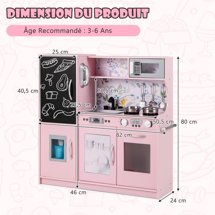 Ils peuvent garder leur espace de jeu bien rangé et développer leurs compétences d'organisation dans un contexte de jeux engageants. Vous êtes sur le bon comparateur de prix si vous cherchez où acheter DREAMADE Cuisine Enfants avec Lumières et Sons Réels, Evier, Four, Mic... au meilleur prix en France au rayon Jouets pour enfants Description : Créez une expérience culinaire dynamique pour votre enfant de 3 ans et plus avec cet ensemble de cuisine interactif. Sécurité et Beauté — Fabriqué à partir de matériaux adaptés aux enfants, cet élégant ensemble de cuisine présente des bords arrondis et des surfaces lisses pour la sécurité de votre tout-petit. C'est un merveilleux cadeau éducatif pour Noël, les anniversaires et tout autre moment significatif. Outil d'Apprentissage Créatif — Idéal pour les enfants de 3 ans et plus, cette cuisine de jeu favorise la créativité, la motricité fine et améliore les interactions sociales saines avec les pairs et les membres de la famille. Qu'il s'agisse d'une surprise de Noël ou d'un cadeau d'anniversaire, ce jouet éducatif apportera de la joie et l'apprentissage à votre enfant. DREAMADE Cuisine Enfants en Bois de Sapin avec Plaque de Cuisson, Evier Options de Jeu Polyvalentes — Cet ensemble de cuisine pour enfants comprend divers appareils comme un four, une cuisinière, un micro-ondes, un téléphone et une machine à laver. Il stimule la créativité, la motricité fine et les interactions sociales. Le distributeur d'eau est doté de lumières colorées et le robinet tourne, captivant le cœur de votre jeune chef. Matériau. Bois d'ingénierie · Couleur. Rose · Marque. DREAMADE · Dimensions du produit. 25P x 82l x 80,5H centimètres · Tranche d'âge (description). 3 Ans · Poids... Cuisine Bebe DREAMADE Cuisine Enfants, Avec Lumières Et Sons, Four, Evier, Distributeur D'eau, Machine à Laver, Téléphone, Ensemble De Jouets De Cuisine, Pour Enfants De 3+ Ans, Blanc (Blanc Cuisine En Bois Effets Attrayants — Equipé de brûleurs qui s'allument et de boutons rotatifs qui cliquent, cet ensemble de cuisine recrée un environnement de cuisine vivant.