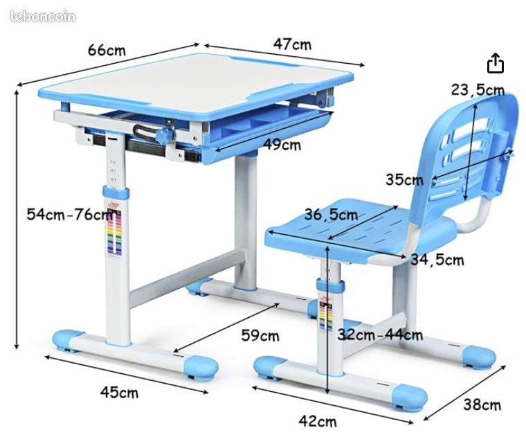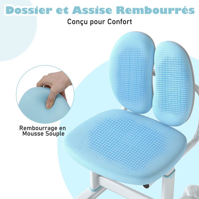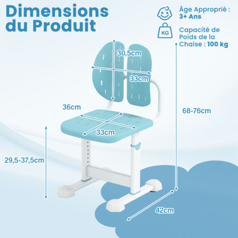 Spécifications : Couleur : Bleu/Gris/Rose Matériau : PP, métal Dimensions hors tout : 42 x 36 x 68-76 cm (L x l x H) Hauteur d'assise : 29,5-37,5 cm Dimensions d'assise : 36 x 33 cm Âge recommandé : 3 ans et plus Charge maximale de la chaise : 100 kg Poids net : 4 kg Contenu de l'emballage : 1 x Chaise de bureau pour enfant 1 x Manuel d'utilisation Grâce à sa hauteur réglable, les enfants peuvent choisir la position assise la plus confortable. Le double dossier et l'assise souple permettent aux enfants de s'asseoir et de se détendre, soulageant ainsi la fatigue. Sa capacité de charge est de 100 kg. 【Construction stable】La structure en métal massif assure la solidité et la robustesse de la chaise. Siège Réglable Hauteur Dossier Ergonomique 100kg Chaise De Bureau Pour Enfant Réglable En Hauteur Avec Double Dossier Et Assise Respirante Structure En Métal Robuste Pour 3+ Ans Bleu Chaise Bureau Fille Il aide votre enfant à développer une bonne posture assise. 【Utilisation polyvalente】Mesurant 42 x 36 x 68-76 cm, la chaise convient à la plupart des bureaux. Le double dossier permet aux enfants de maintenir une posture correcte. 【Siège sûr et confortable】Le siège offre suffisamment d'espace pour que votre enfant puisse s'asseoir. Grâce à sa hauteur réglable, les enfants peuvent choisir la position assise la plus confortable. Le double dossier et l'assise souple permettent aux enfants de... Description : Créez un espace d'assise sûr et accueillant pour vos enfants avec notre chaise d'étude ! Angles arrondis pour une prise en main sûre Structure métallique robuste pour un soutien optimal Pieds élargis et coussinets réglables pour une stabilité optimale Surface lisse pour un nettoyage facile Idéal pour le bureau à domicile, la salle d'étude, la salle de lecture, etc. De plus, la hauteur d'assise est réglable de 29,5 à 37,5 cm, pour s'adapter aux différents stades de croissance. De plus, les pieds élargis et les coussinets réglables assurent une excellente solidité et stabilité, rendant les mouvements de votre enfant difficiles. Conçue pour offrir un soutien optimal lors de longues heures de travail ou d'étude, cette chaise présente un design ergonomique qui s'adapte parfaitement aux courbes des enfants et répartit la pression sur le corps Chaise de Bureau Pivotante Enfants avec Hauteur Réglable 77 【Dossier double】Le double dossier ergonomique s'adapte parfaitement à la courbe de la colonne vertébrale de l'enfant, offrant protection et soutien lombaire.