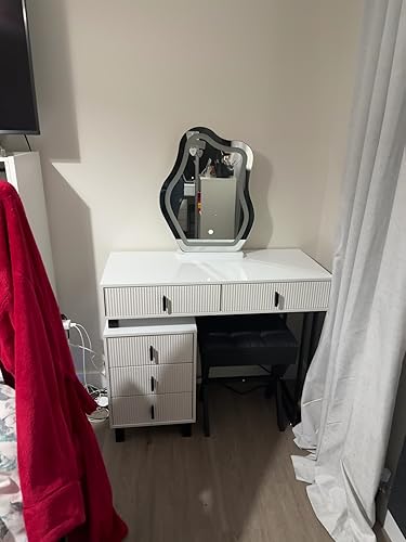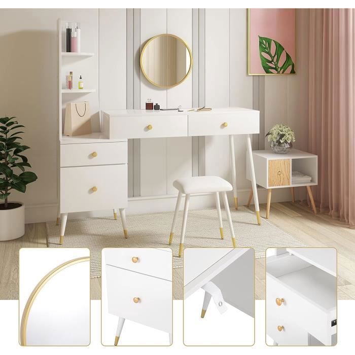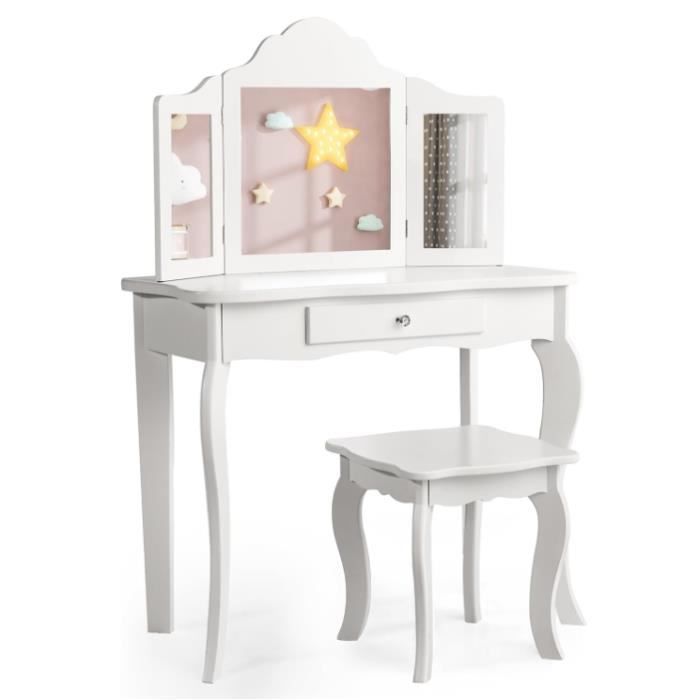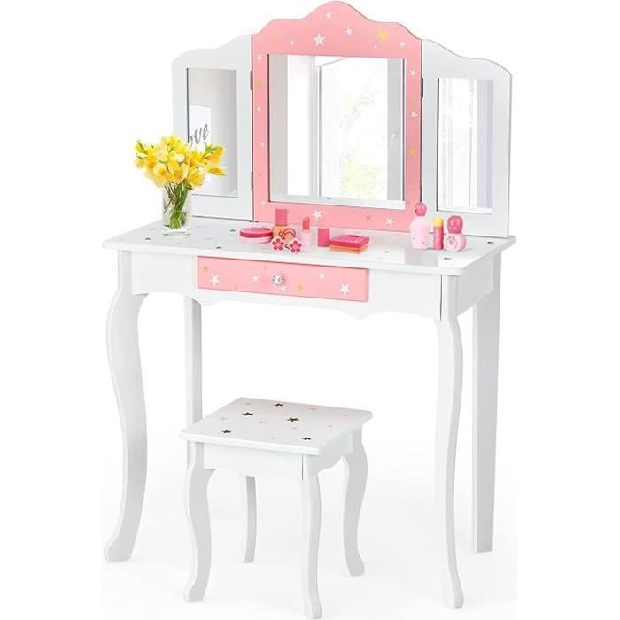 Meuble Maquillage Fille Bois Miroirs Pliables HOMCOM Coiffeuse Pour Enfant Avec Tabouret 3 Miroirs Et Tiroir 3 à 6 Coiffeuse Chambre Enfant Design Princesse Facile à installer : comprend 3 miroirs pliables et un tabouret. Compartiment secret dans le tabouret grâce à un mécanisme de pliage ingénieux; Miroir et tiroir pour ranger les cosmétiques et bijoux essentiels; Trois miroirs... 3 miroirs pliables pour offrir une vue complète et claire ... 2 en 1 Coiffeuse Enfants et Tabouret avec Miroir Amovible à Trois Volets, 70x34x103CM(Blanc Elle se compose d'une coiffeuse et d'un tabouret avec miroir intégré et espace de rangement. Équipé d'instructions détaillées (français non garanti) et d'un kit de montage simple, le montage est très simple. Coiffeuses Pour Enfants Coiffeuse Enfant Fille 3-7 Ans Avec Offrez à votre enfant sa première coiffeuse vraiment belle Spécifications : matériau : MDF, paulownia Couleur : rose/blanc Groupe d'âge : 3-12 ans Taille de la table : 70 L x 35 l x 104,5 H cm Dimensions du tabouret : 30 L x 30 l x 31 H cm Taille du tiroir : 31 L x 27,5 l x 5,6 H cm Poids d'expédition : 14,0 kg Contenu de l'emballage : 1 coiffeuse 1 tabouret de maquillage. Détails : le kit de maquillage dispose de coins arrondis et de pieds incurvés sur la table et le tabouret qui offrent à la fois sécurité et style. Description : ce charmant kit de maquillage est idéal pour les enfants qui aiment pratiquer leurs compétences en tant que coiffeur. Rangement : un grand tiroir central sur la coiffeuse pour enfants offre un grand espace de rangement pour les affaires de votre enfant. Design sophistiqué : la poignée de tiroir est recouverte de verre recouvert de verre incrusté de nombreux petits cristaux et a un effet diamant. Matériau de haute qualité : fabriqué en MDF E1 durable et en bois de paulownia, avec des coins arrondis, sans danger pour les enfants et facile à nettoyer, de belles nuances pastel rendent la surface lisse et brillante. 1 kit d'accessoires, 1 manuel d'utilisation (français non garanti).