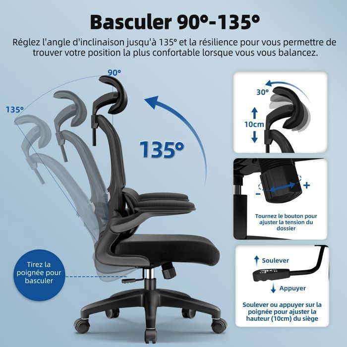La chaise de bureau Vigosit conçue pour le bureau à domicile européen. En plus, elle pivote à 360° et tu peux même te balancer un peu (20° max). Tissu respirant, cuir PU et tige à gaz certifiée pour supporter jusqu'à 150 kg Le dossier ergonomique avec technologie de zones de pression s'adapte intelligemment à votre colonne vertébrale. Confort double densité : respirant et stable : filet élastique confortable + siège en mousse à mémoire de forme. Glisse en douceur et protège les sols délicats tels que le parquet ou le stratifié. Chaise Ergonomique Sihoo BAKAJI Chaise De En Tissu Respirant Et Anti-transpiration, Dossier Avec Support Lombaire Et Appuie-tête, Fauteuil D'étude Bureau Hauteur Réglable à Gaz 116-126 Cm (Azur Bureau Ergonomique Le soutien lombaire renforcé offre un maintien ciblé et prévient la fatigue. Parfait pour un travail concentré ou une courte détente. Base silencieuse professionnelle : étoile en nylon renforcé + roulettes gainées de caoutchouc (< 30 dB). Garantit un travail confortable même dans un espace limité. Aiidoits Chaise Bureau Ergonomique, Chaise de Bureau Inclinable Soulage le cou, les épaules, le dos et la région lombaire. La chaise de bureau Vigosit conçue pour le bureau à domicile européen. Le dossier ergonomique avec technologie de zones de pression s'adapte intelligemment à votre colonne vertébrale. Avec l'assise de 8 cm d'épaisseur, elle assure un confort même après des heures et favorise la circulation sanguine