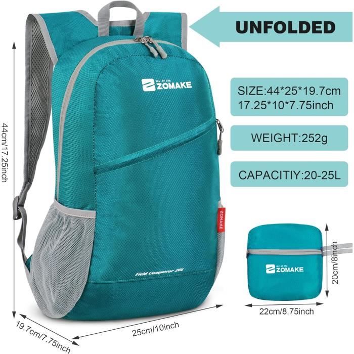 Informations de base : ce sac à dos de randonnée est fabriqué à partir de fibres 100 % polyester, mesure 42 cm * 28 cm * 20 cm et pèse environ 0,16 kg Survol Le sac à dos pliable Lifestyle Aonjie de Stimula pourrait vraiment être pratique pour les voyageurs aventuriers. Avec sa capacité de 20 l, les articles nécessaires pour une randonnée peuvent facilement être rangés Tissu polyester Résistant aux éclaboussures Le tissu polyester protège le contenu en cas de pluie légère, mais l'humidité peut tout de même pénétrer en cas de forte pluie ou d'immersion prolongée. Tissu résistant à l'eau : protège le contenu de la pluie légère et de l'humidité, mais n'est pas entièrement imperméable - l'humidité peut encore pénétrer par les fermetures éclair et les coutures Utilisation polyvalente : convient comme sac à dos de randonnée, sac de trekking, sac à dos de jour, sac de voyage, sac à dos de ski ou sac à dos de cyclisme Léger et pliable : le sac à dos se plie facilement dans une pochette compacte, occupant ainsi un minimum d'espace. 2 poches latérales en filet Les poches latérales en filet permettent de ranger facilement des bouteilles d'eau, des parapluies et autres objets similaires pour une utilisation immédiate. Comparatif : Les 5 meilleurs sacs de randonnée 20L 2025 Plus de détails Fermeture éclair facile à utiliser Compartiment principal de 20 l Le compartiment principal de 20 litres peut accueillir des objets plus volumineux tels que des vêtements, des livres et des appareils électroniques. Se plie facilement et se range sans encombrer lorsque vous êtes en déplacement. Pour les randonnées courtes et simples qui nécessitent peu de matériel, il est préférable d’opter pour un petit sac à dos 20L. Ce guide des meilleurs modèles de la saison vous aidera à choisir votre sac à dos journée Sac Hydratation Running Sac à Dos De Randonnée Léger, Sac à Dos Pliable 20L Pour Voyage Sac à Dos Randonnée Intersport 1 sac de rangement Lorsque le sac à dos est utilisé, le sac de rangement sert d'espace de rangement supplémentaire ; lorsqu'il n'est pas utilisé, le sac à dos plié peut y être rangé.